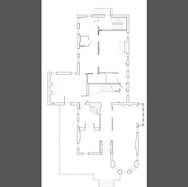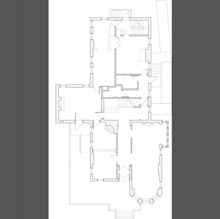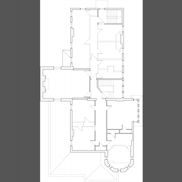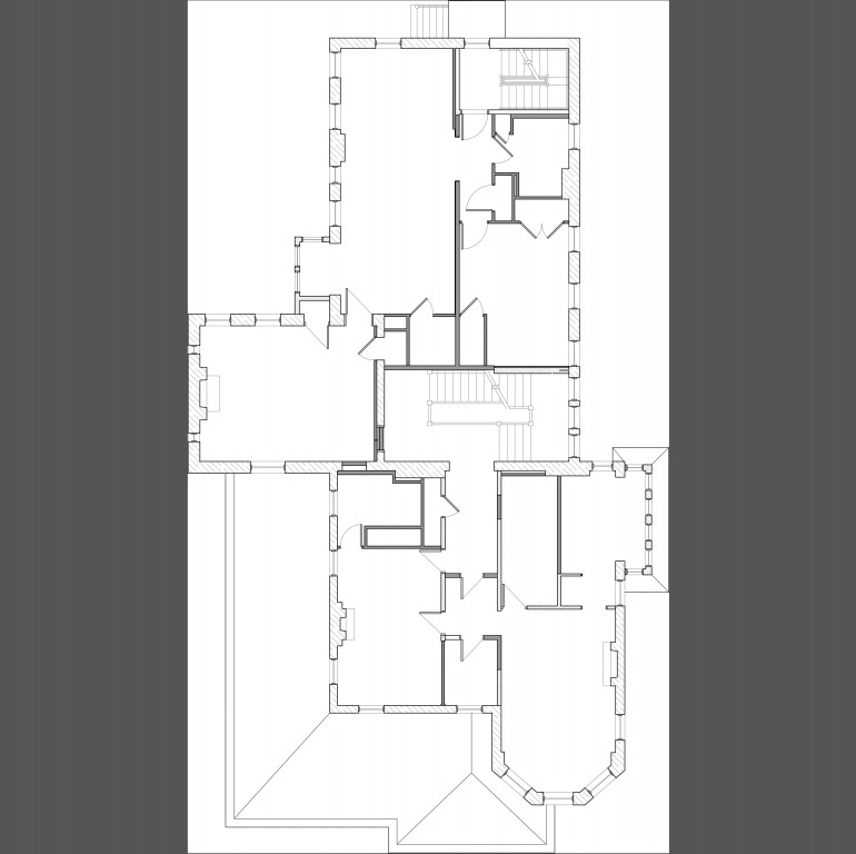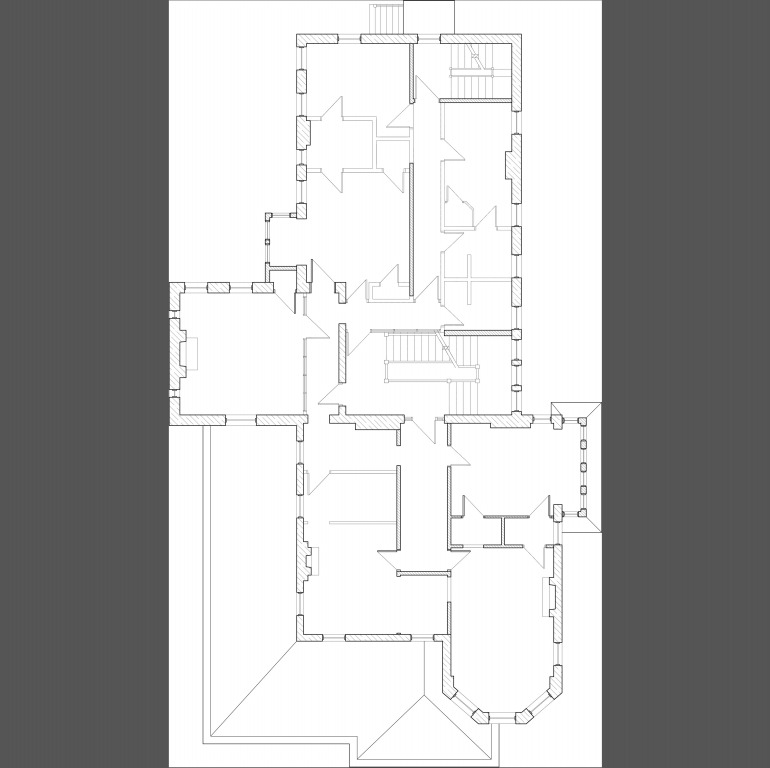 Ductwork for the HVAC system, second floor, future primary bedroom, owner’s unit; framing in east side parlor, first floor; new configuration, hallway, second floor, owner’s unit; framing and ductwork, second floor bedroom, owner’s unit; shower, bathroom in primary bedroom, second floor, owner’s unit; electrician’s ladder, billiard room, third floor, owner’s