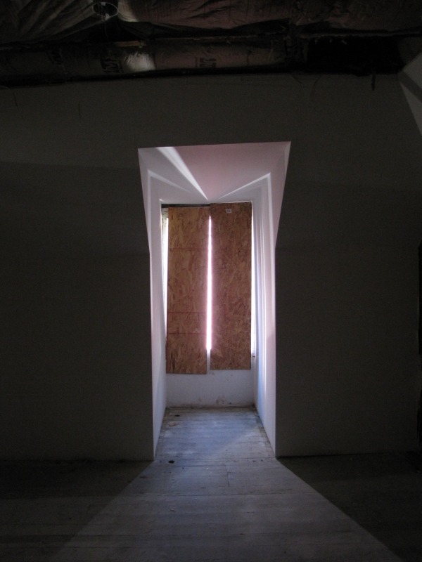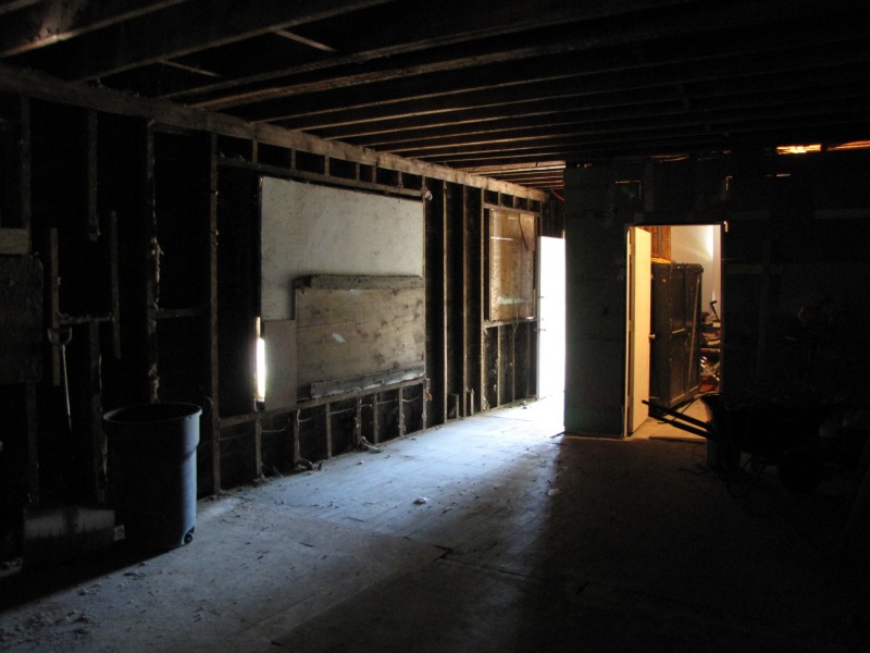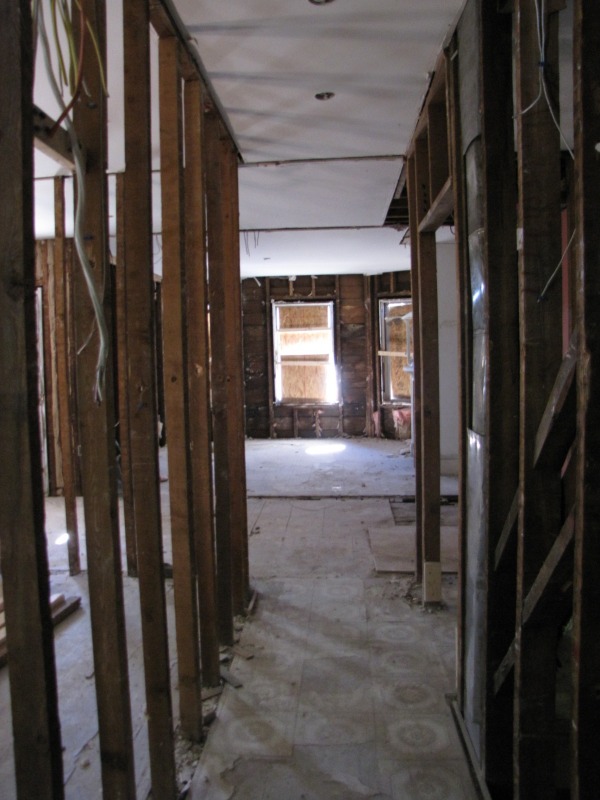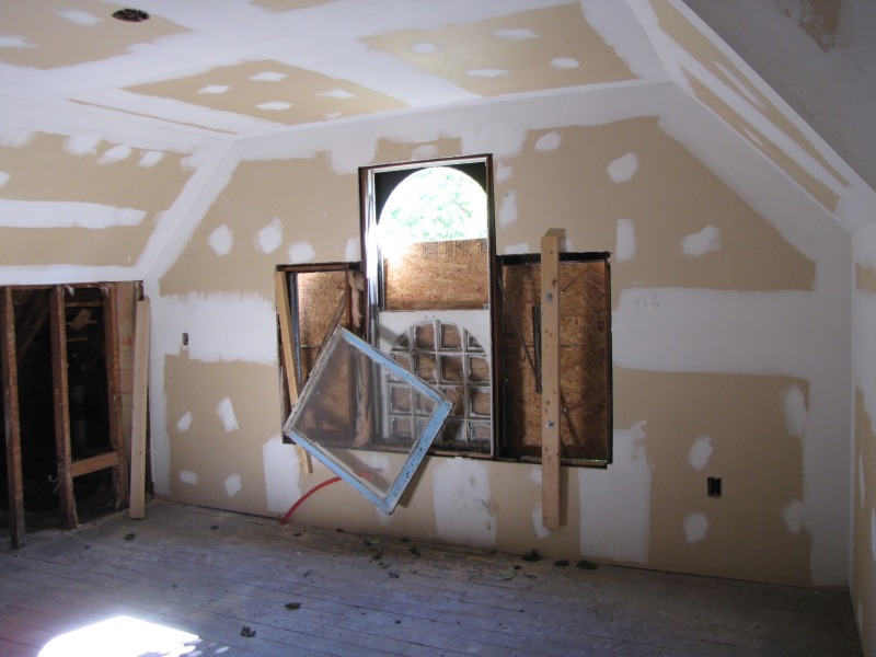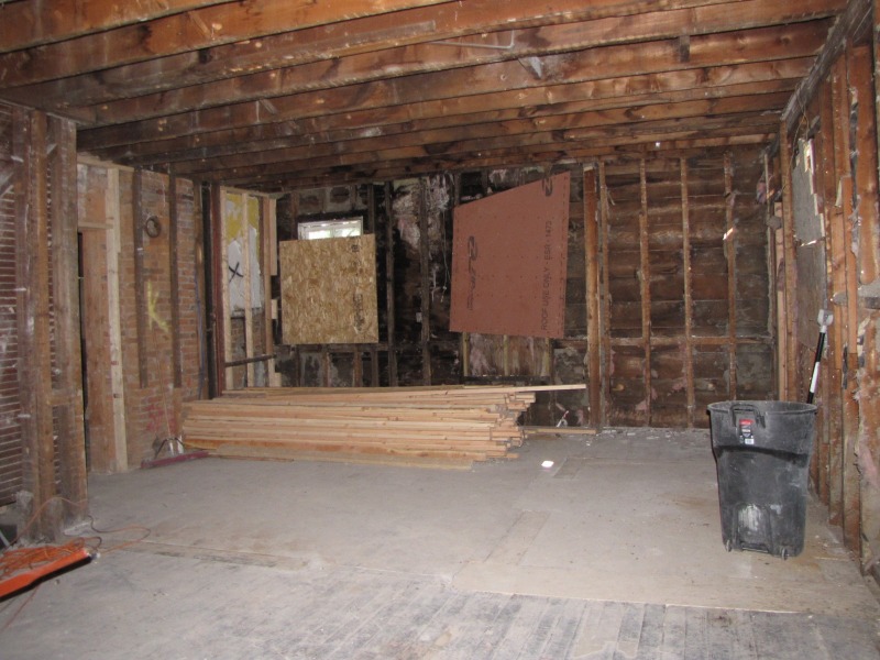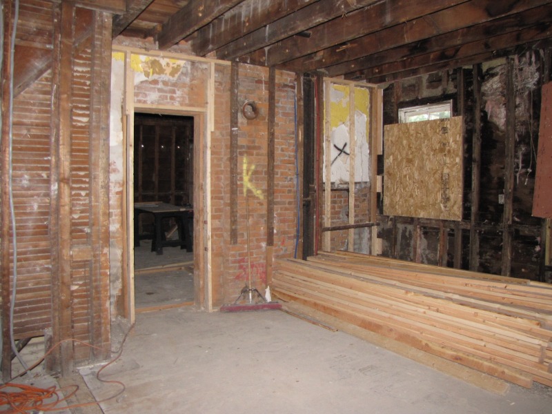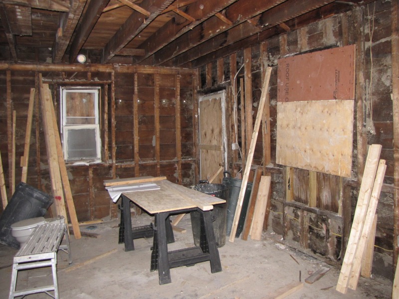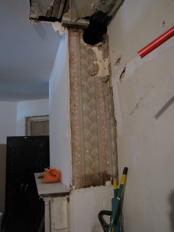 The old floor plan is now largely gone, and we’re getting ready to restore the house to its original, side-by-side, two-family layout. Some artifacts uncovered as well, especially some wallpaper that predates the effort to transform this house into a three-family. Oh, and Mike Stockman, atop the third-floor staircase.
