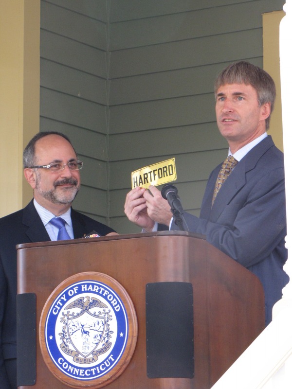 To commemorate The Hartford’s role in and substantial contribution to the construction of 33 Sargeant Street, Ken Johnson presented Robert Yass with an antique fire plaque from the Hartford Fire Insurance Company. These plaques were used in the 19th century to indicate that a house had fire insurance, and Hartford Fire is a predecessor of today’s Hartford Financial Services Group.