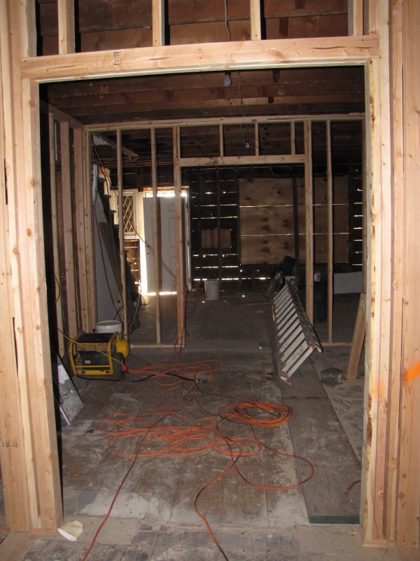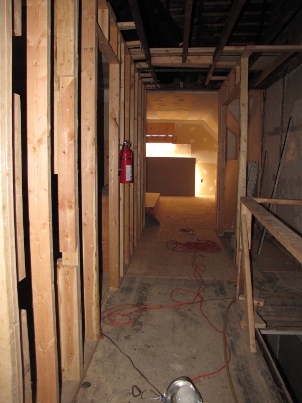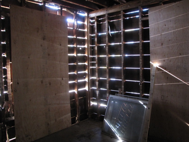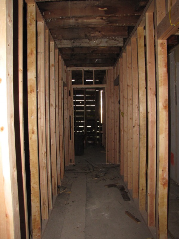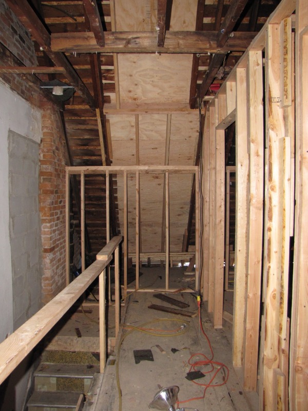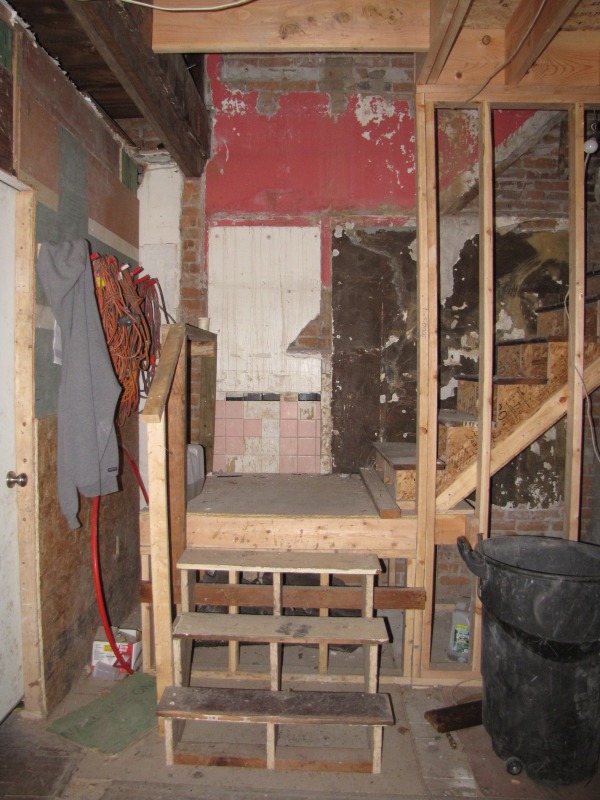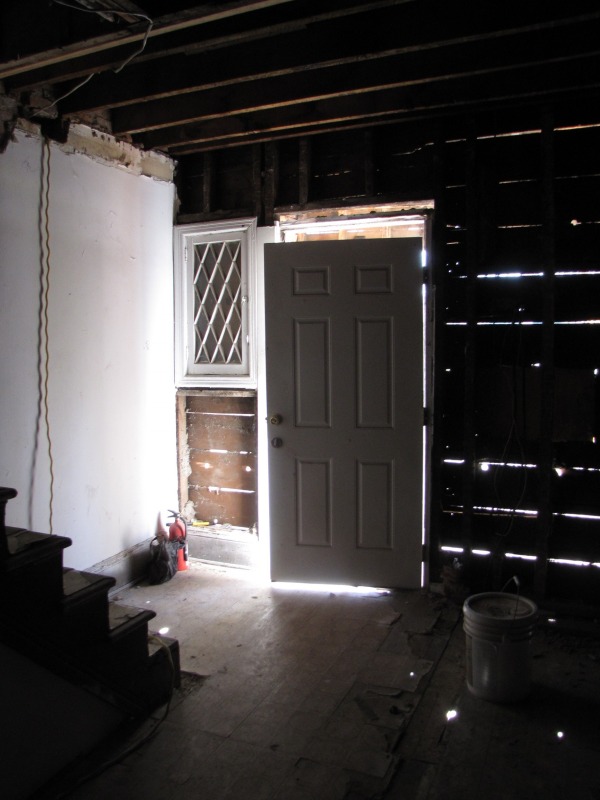 Work continues on the exterior, and framing has begun in the interior. In some of the pictures, there are clear views of previous wall treatments, ranging from tile to paint to wallpaper, and not always where expected.