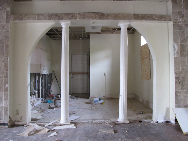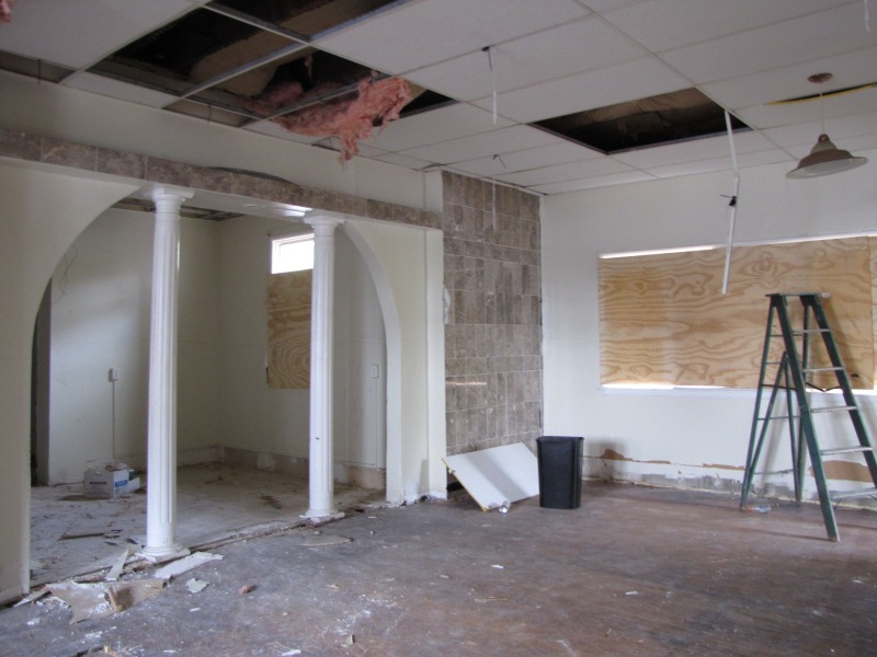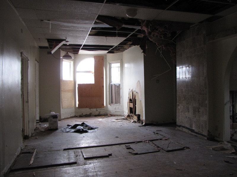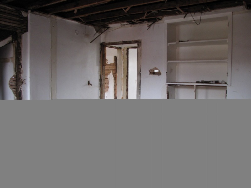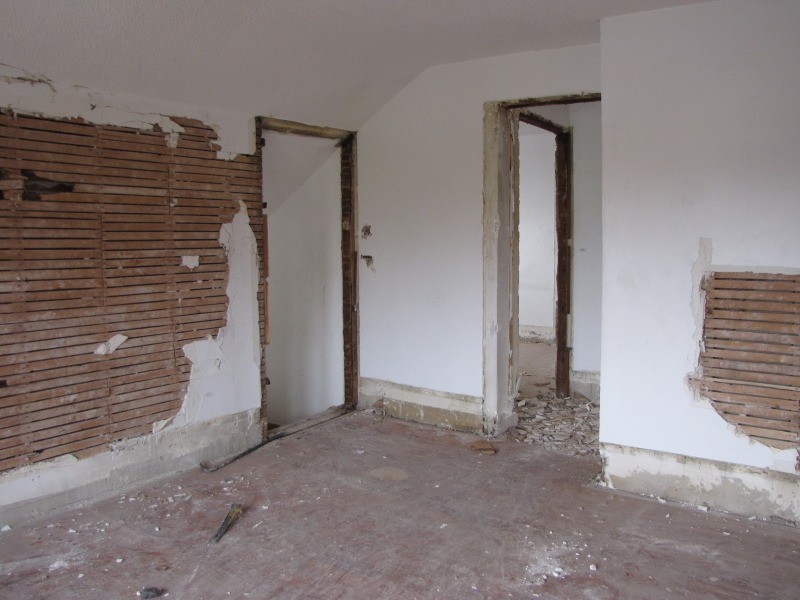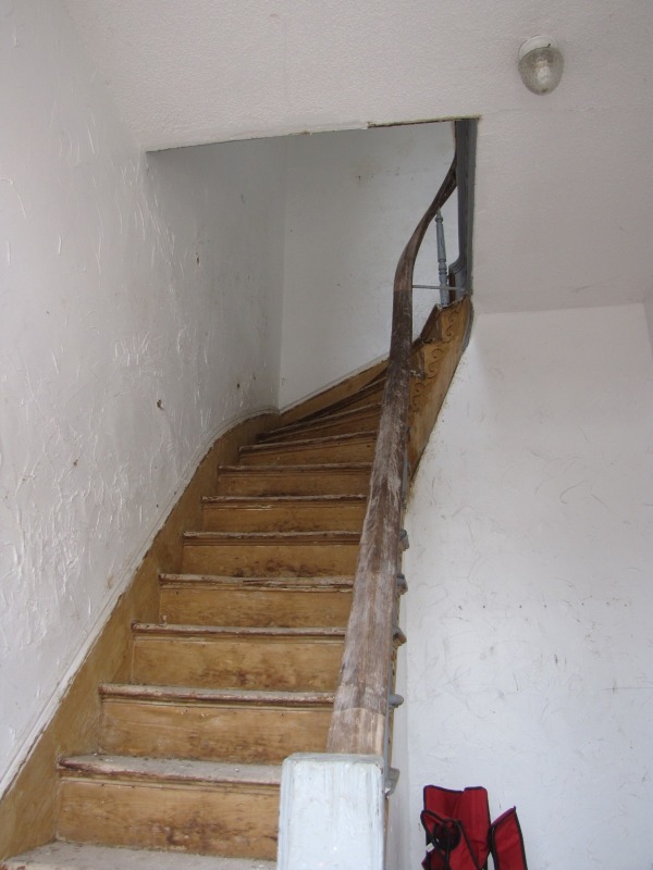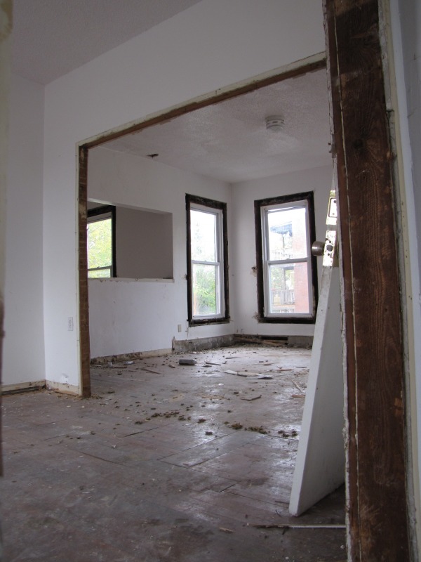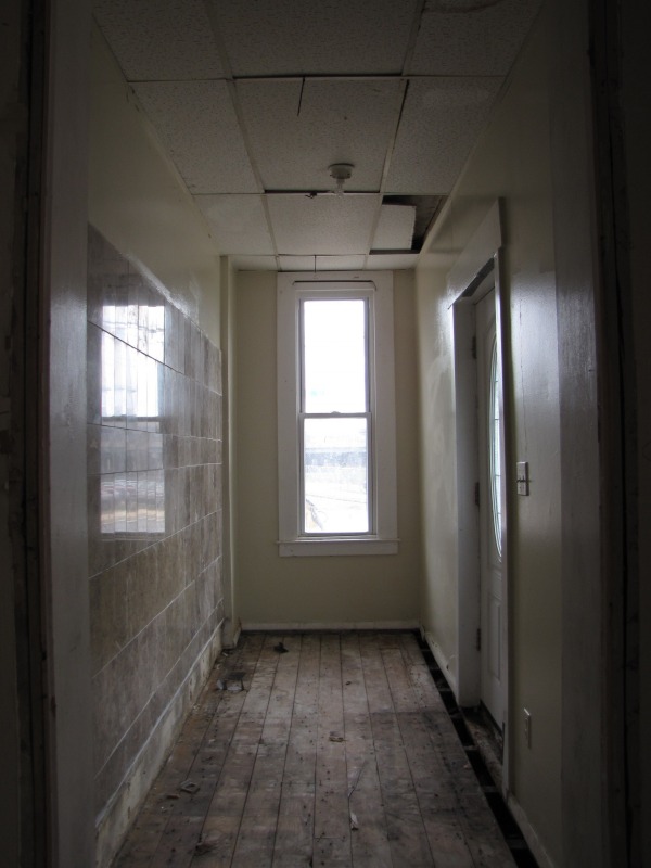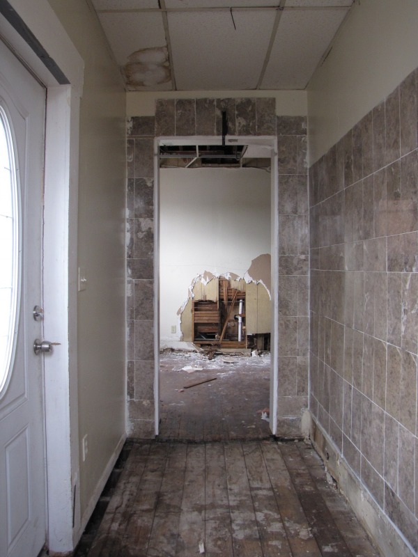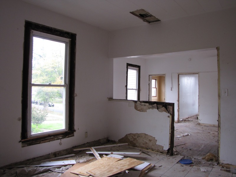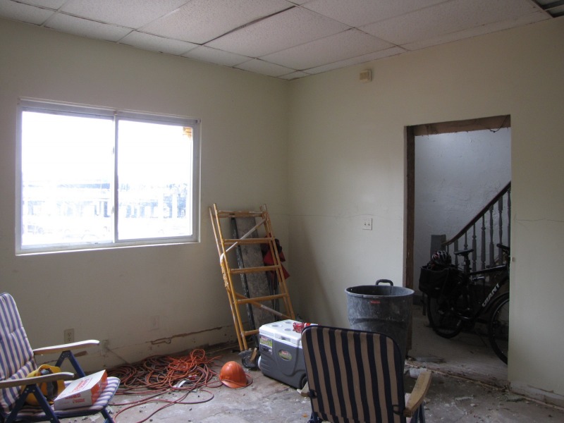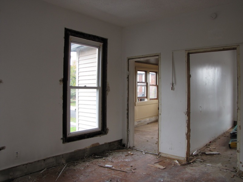 Some preliminary demolition has been done, mostly to see what was beneath the newer material, but the break room has arrived, which means work is imminent. Although some of the new stuff, like trim, has been removed, this is probably the last best look at the house in its “pre” state.