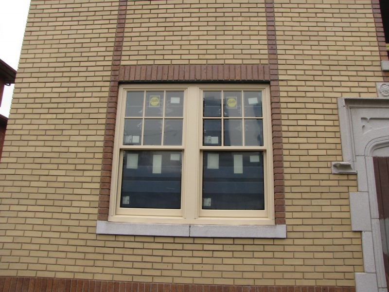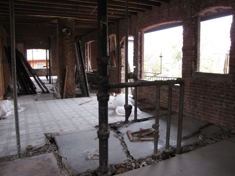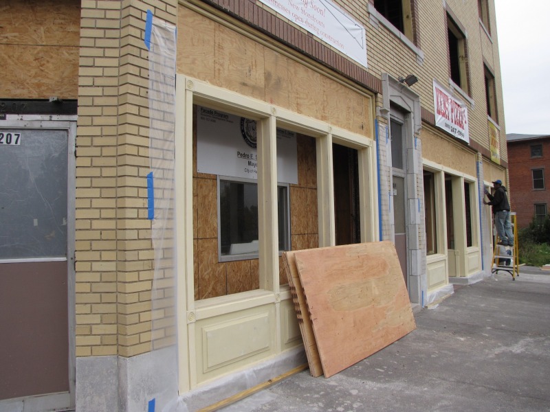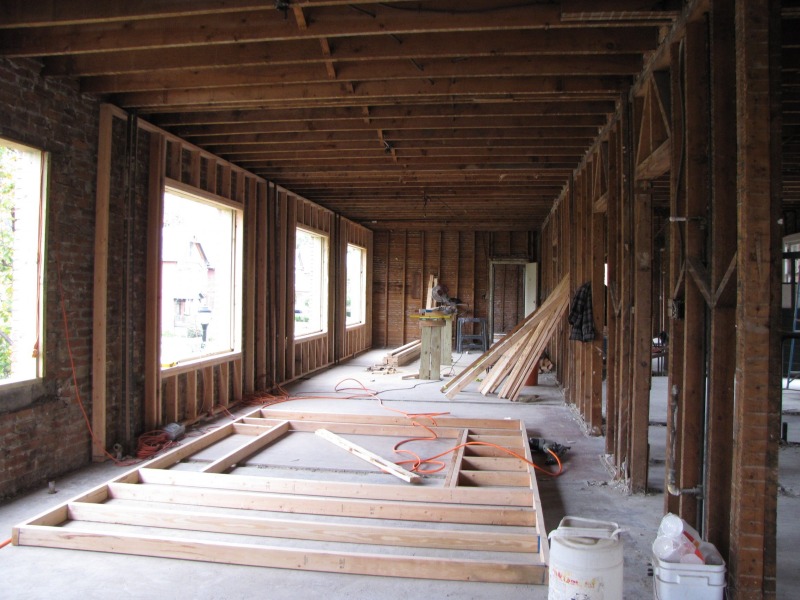 Framing on the interior, windows in on the south side, and work on the east façade.