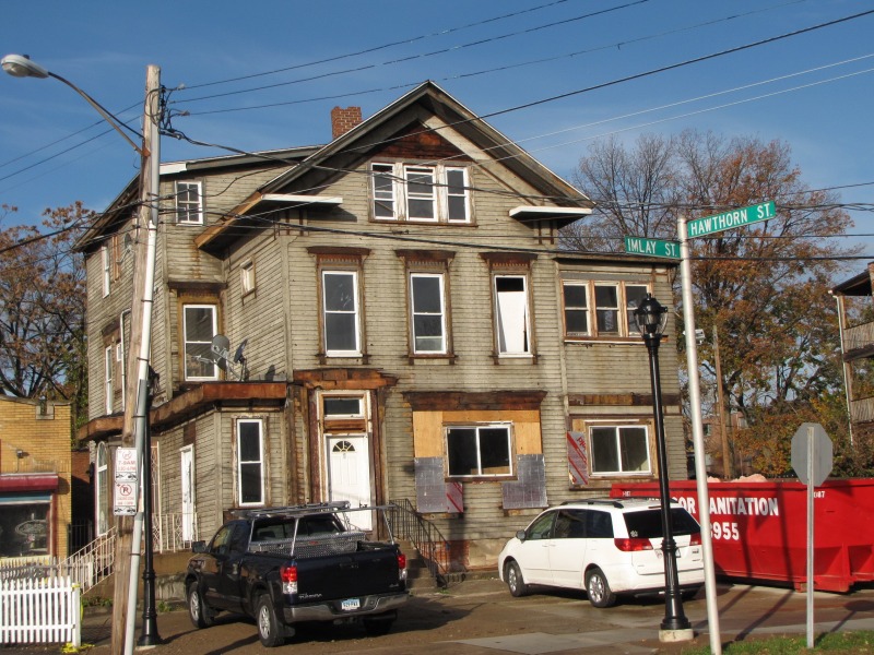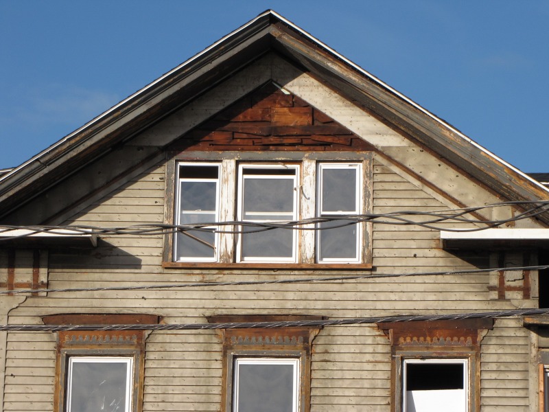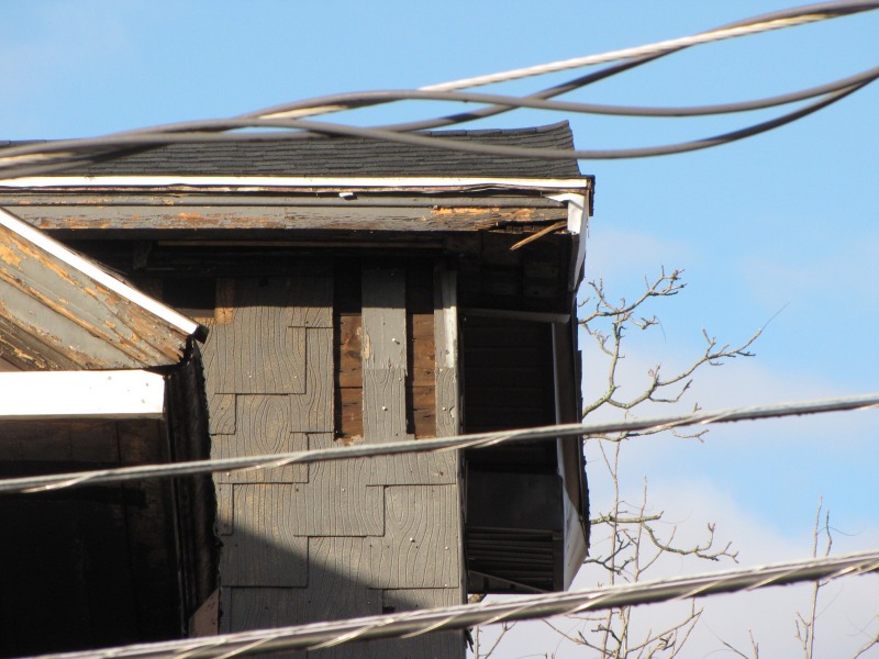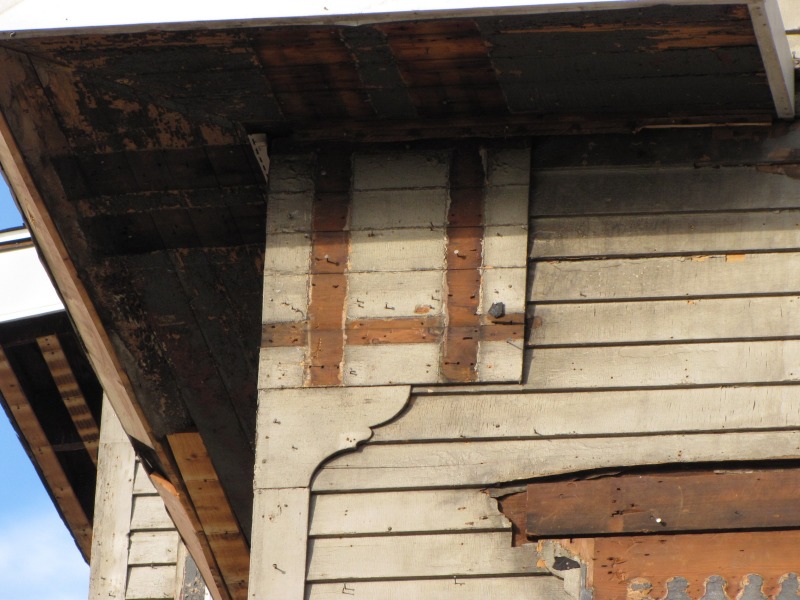 We’ve got 1 Imlay down to its original siding, and now you can get a better look at the original house and how it was altered over the years. Both the side entry (on the south side, in front of the bay window) and the front rooms on the first and second floors (northeast corner) are later additions to the structure. Also, we discovered that the house used to have decorative woodwork: shadow lines under the soffit and above the windows indicate that there were brackets and window crowns. Given some of the extant decorative woodwork in Nook Farm from the same time period, it’s like these decorations were highly elaborate, but at this point we can only guess.