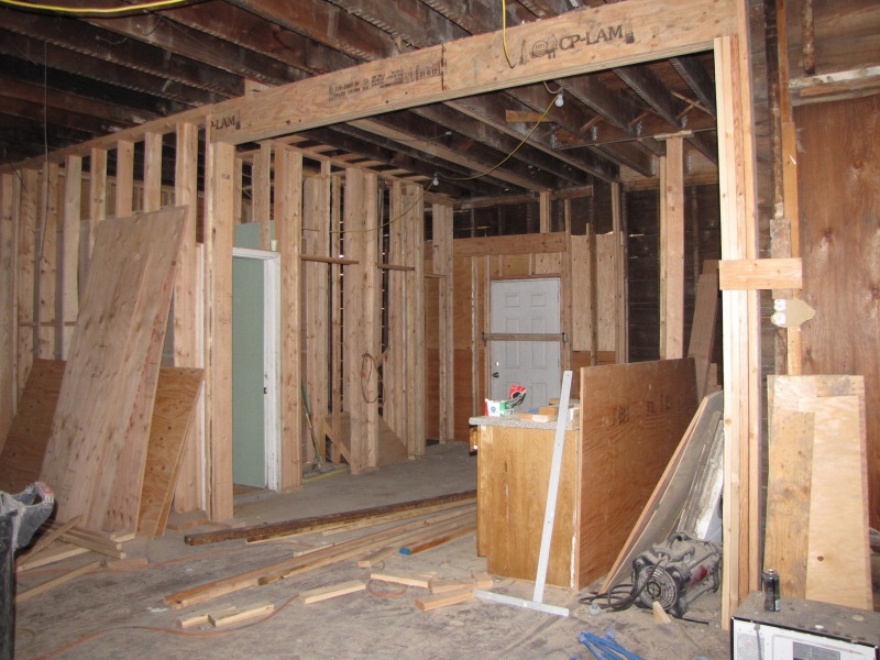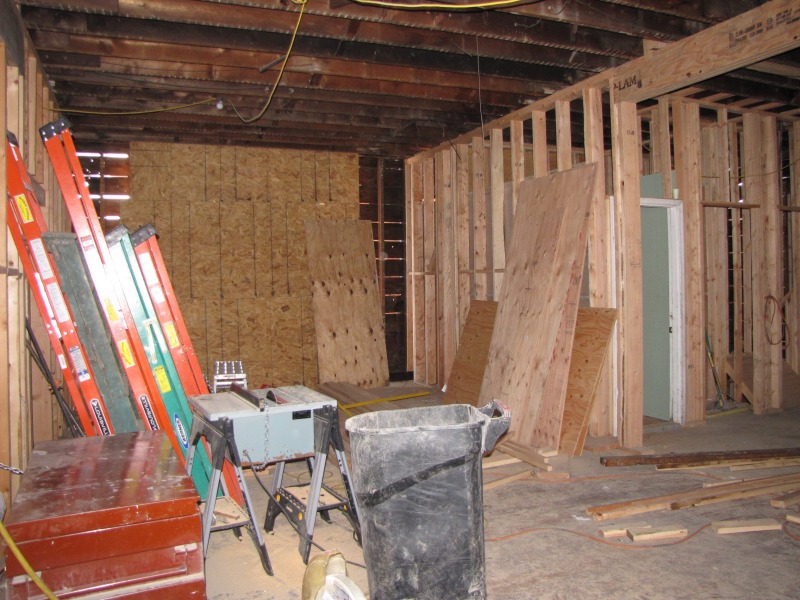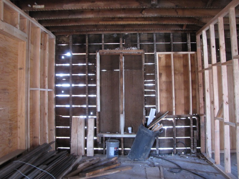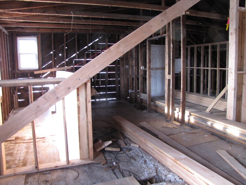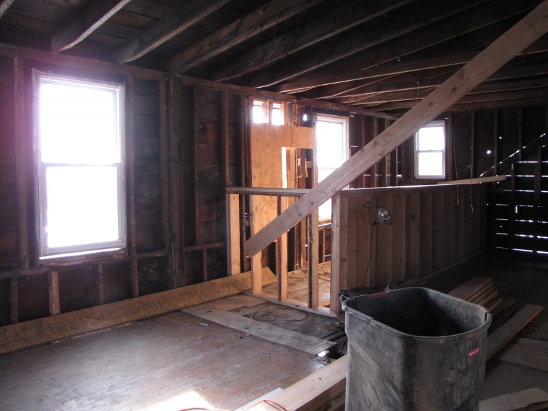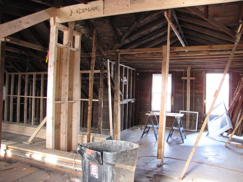 The exterior is taking shape, and the new floor plan inside is emerging. The shape of the roof to come is now discernible -- and with the new framing underway on the third floor, you can also get a clearer picture of how we determined the shape of the historic roof. Basically, any old boards that are straight on the third floor are new.