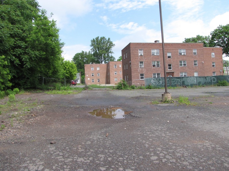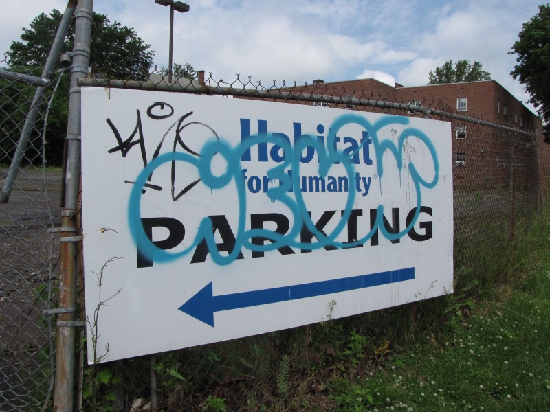 At some point in the future, hopefully sooner rather than later, we’re going to re-create this desolate parking lot as a historically accurate, brand new owner-occupied home. Meantime, we’re letting our friends at Habitat use it as a parking lot for volunteers working on Habitat’s project just up South Marshall Street from here. Sadly, we noticed today, their sign has been battered.