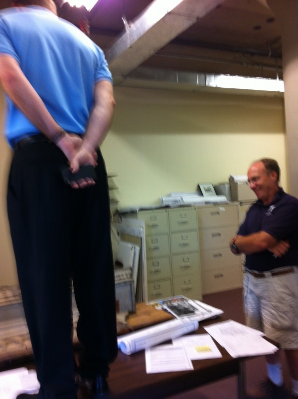 Sorry these shots are blurry, but they were taken on the fly – and on the sly! This is a bit of how we make the sausage at NINA: that’s Ken on a table, getting a bird’s eye view of the window crown we recently uncovered at 1 Imlay. And that’s Mike, catching me out of the corner of his eye, as he knows all of what I’m about.