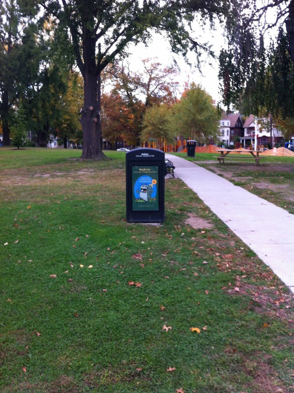 Newly installed at Sigourney Square Park: a Big Belly! Big Belly trash receptacles are the latest in public garbage collection. They double as trash compactors, which means they can go longer without having to be emptied, and they are solar powered, which means they can run without any external power connections. They are entirely self-contained. Better still, they can call the Department of Public Works when they need to be emptied or if they are in need of other service. How cool is that?