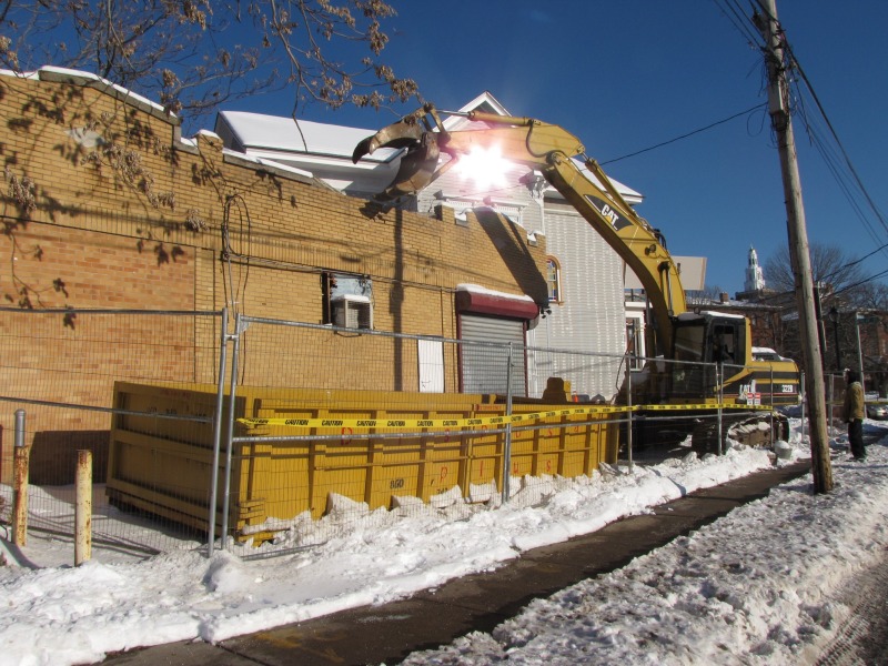 Today is the big day: the former Capitol Liquors will be demolished! Here are the wrecking devices in place, a front-loader with a claw and a dumpster. It is hard to believe that this is all it will take, but I’m assured that it will be.