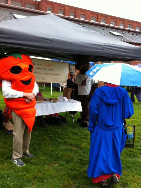 Well, not really. It's the first Fresh Express of the 2014 summer season, and the Happy Giant Carrot greeted people as they arrived at the Farmers Market at Billings Forge. HGC highlighted the importance of good nutrition as well as the difficulties inherent in finding fresh produce in Hartford. The Farmers Market at Billings Forge, now a mainstay of the Frog Hollow neighborhood, offers fresh produce from local and regional farmers every Thursday through October from 11 AM until 2 PM on the Billings Forge Green (just north of the Firebox Restaurant), and the Farmers Market doubles SNAP benefits, so that each SNAP dollar spent at the Farmers Market counts as two.