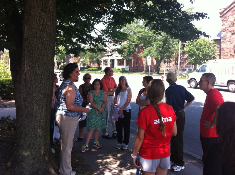 Mary Falvey of the Hartford Preservation Alliance led a group around the four major churches on the Hill today. Mary focused on how the churches' architecture spoke to their congregants as well as to passersby, and then she took the group into the Cathedral of Saint Joseph. The other churches on the tour were Asylum Hill Congregational Church, Asylum Avenue Baptist Church, and Trinity Episcopal Church.