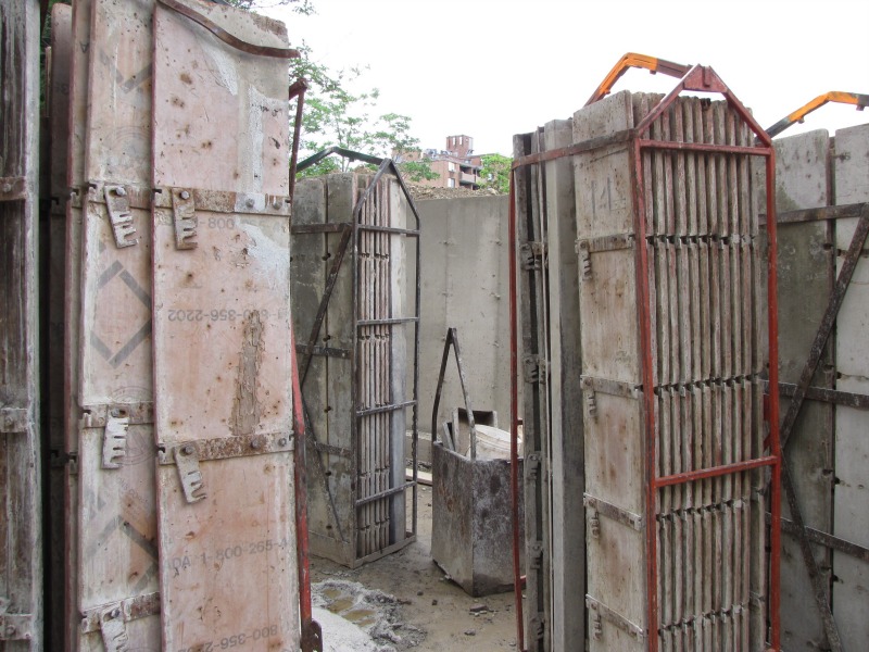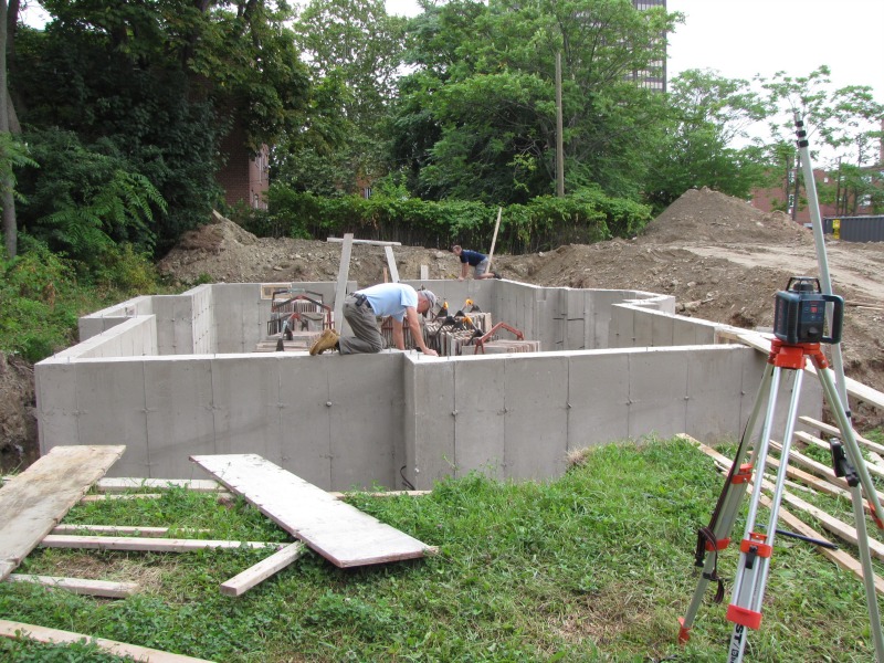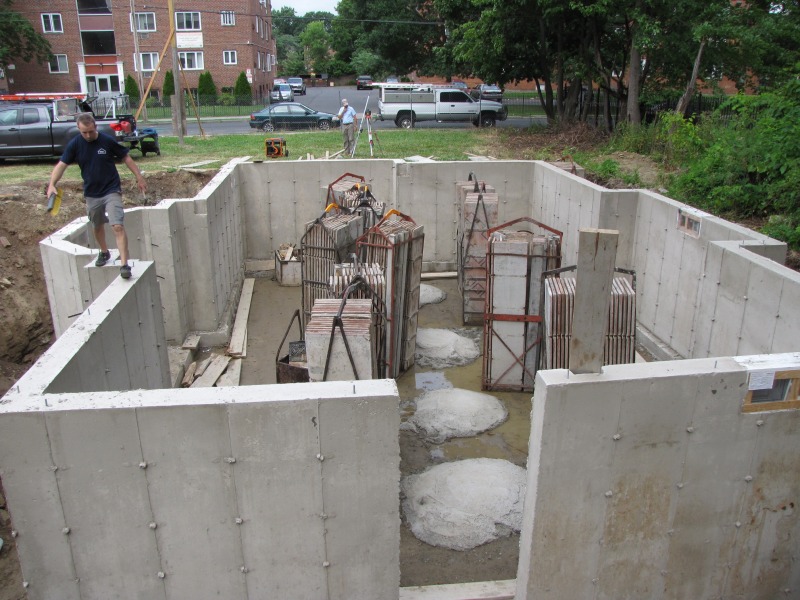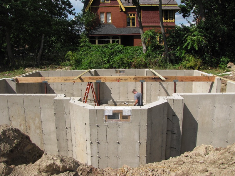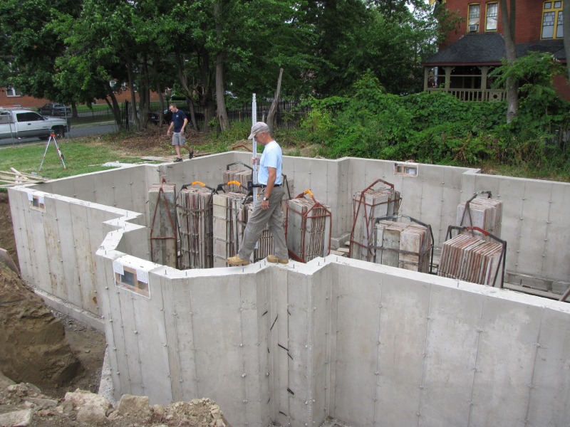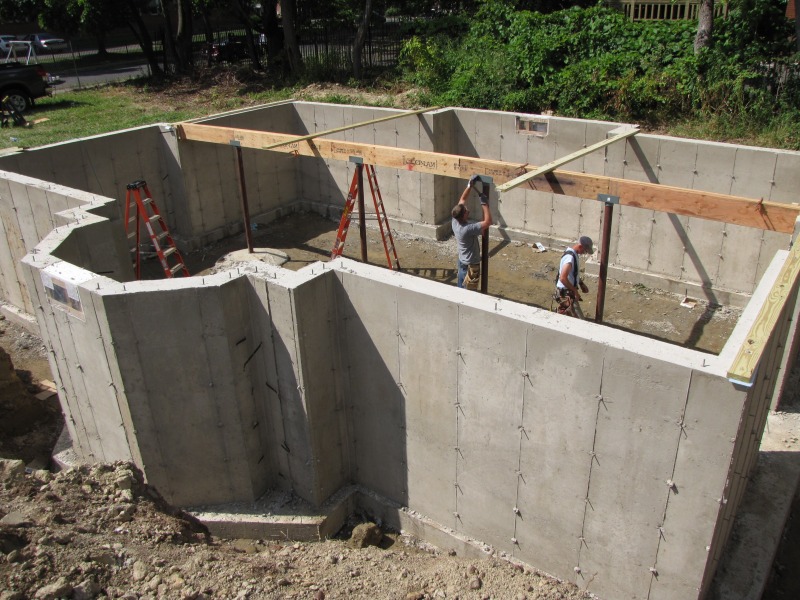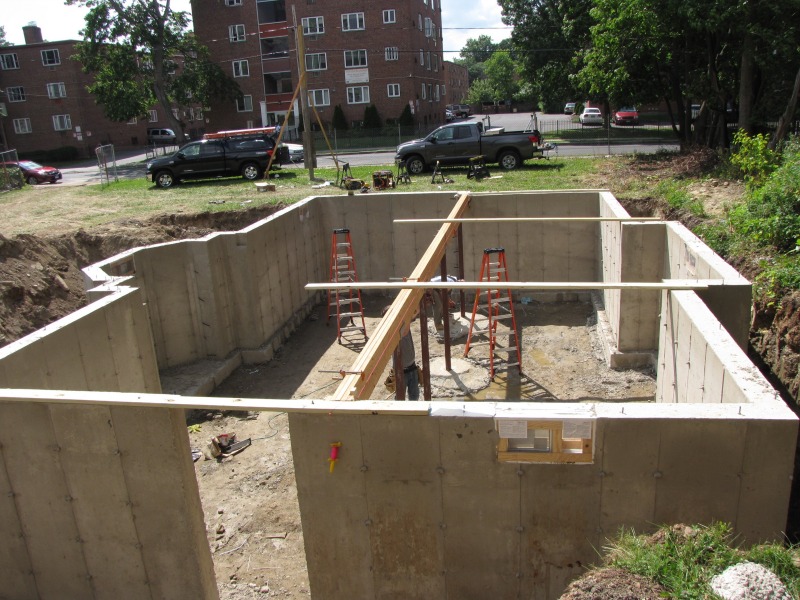 Jeff Giddings and Matt Pearce began work this morning by having a look at the newly set foundation, and then this afternoon they were installing the first beam that will support the house above. Also included one artsy shot (because we must!) that is of the forms into which the concrete was poured, now prepped for transport to their next job.