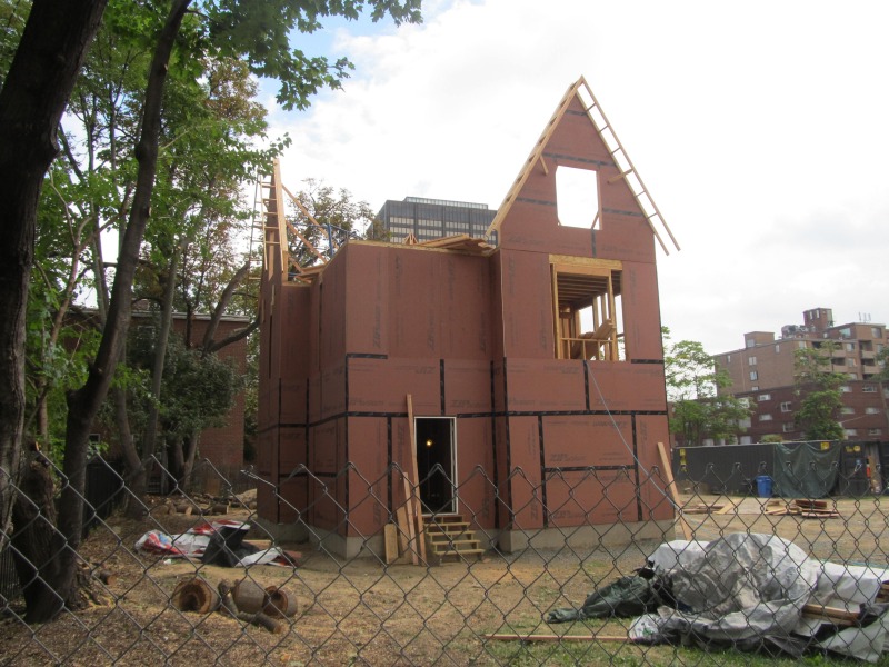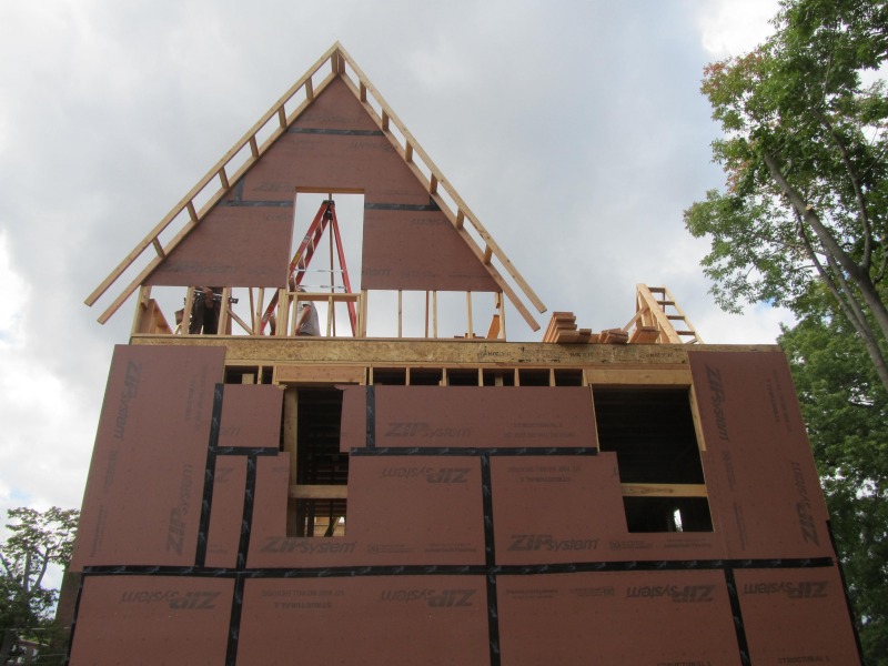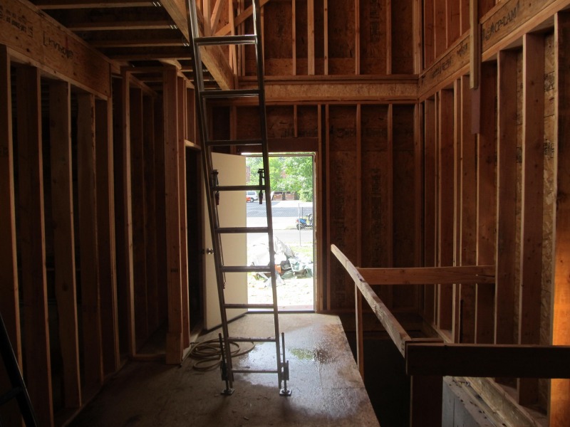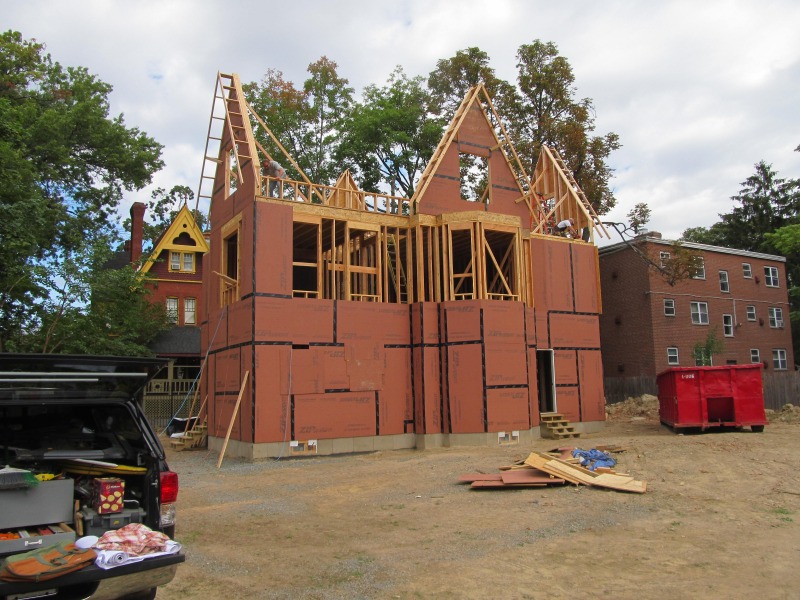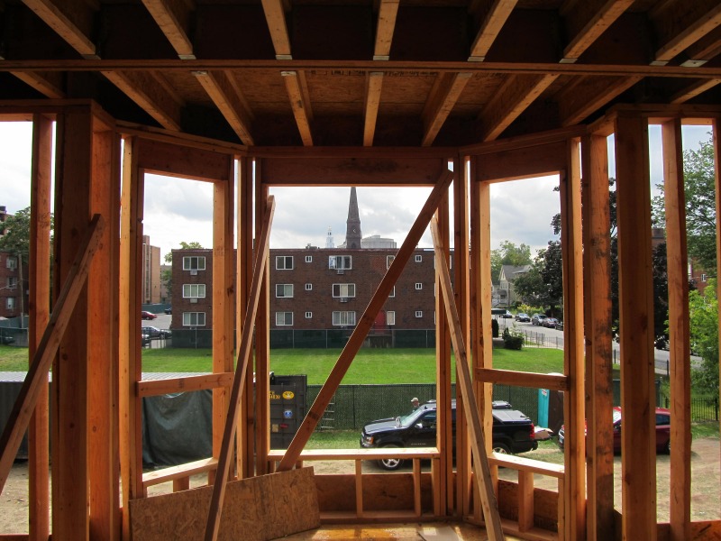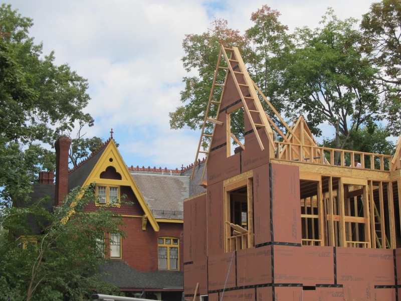 Framing for the third floor -- or "second and a half" floor, or the attic -- is underway, and with it the gables are plainly visible. These were designed to follow the gables at 181 Collins Street (which we still say was designed by George Keller, but that's for another day), and we think we've succeeded. Photos here include shots of the exterior, shots from the top floor, and shots from the interior, where the rooms are framed and the floor plan can now be followed.