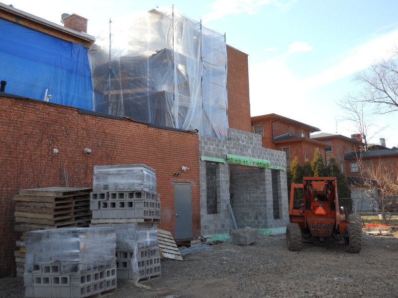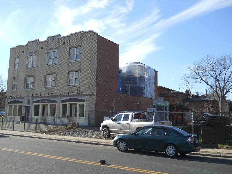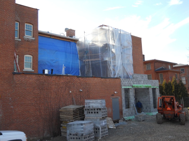 Work on the new elevator at 207 Garden Street progresses steadily. This represents a substantial addition to the buildilng, not just by making it much more accessible to future occupants but also in terms of sheer volume. The blue tarp seen in these pictures hides the former "gangway" access to the fire escape, while the clear plastic protects the new elevator shaft. The cinder block addition is the future new entrance to the apartments on the first and second floor and the offices on the third -- eventually, we will cover the cinder blocks in yellow brick to match the building's facade on Garden Street.