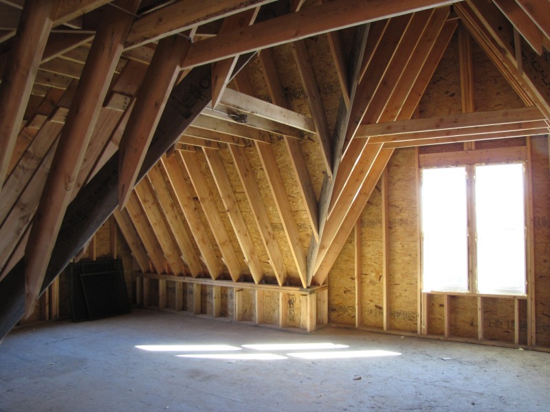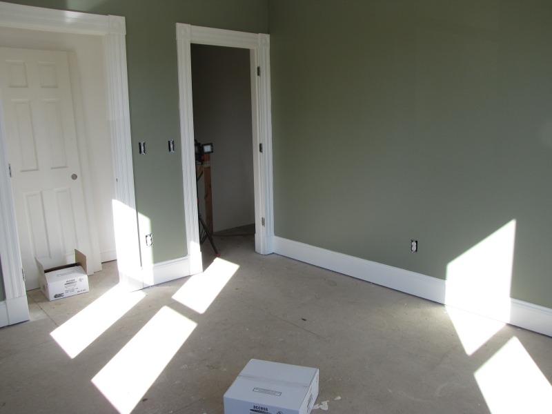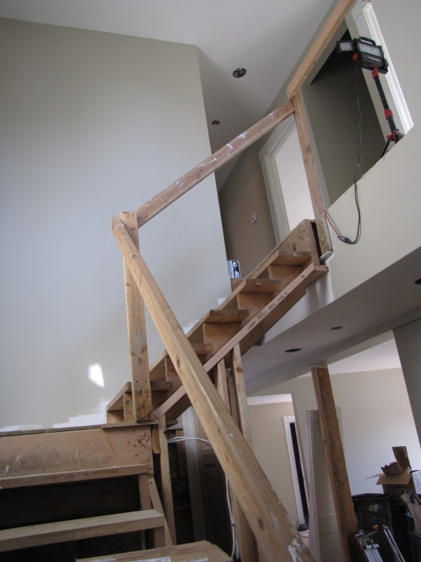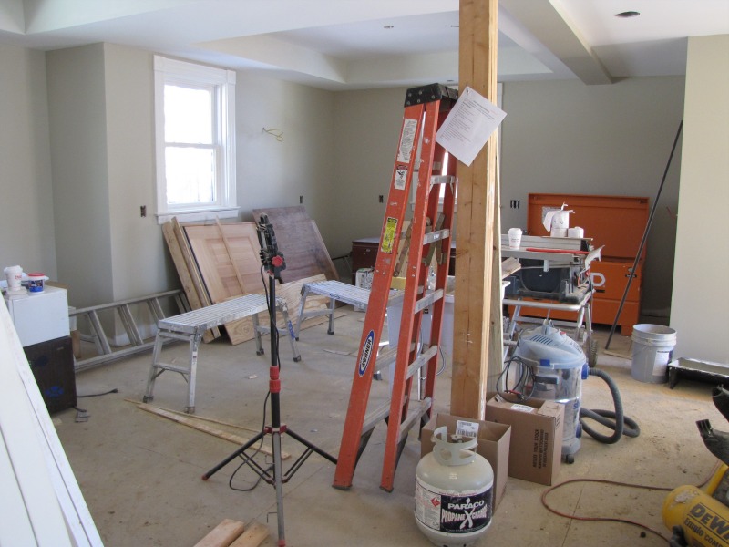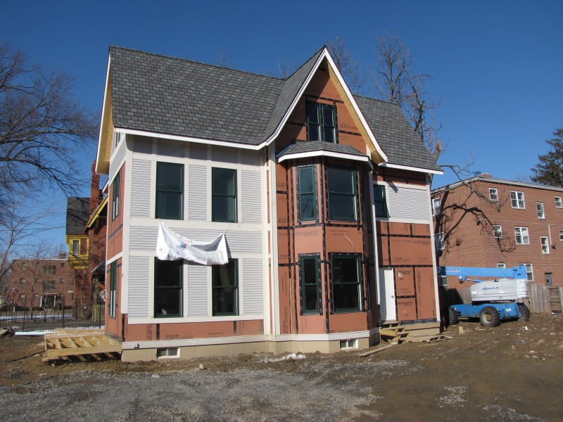 Progress at 54 Huntington: an exterior shot showing the beginnings of the front porch; a look into the kitchen; a look up the staircase (not for the fainthearted!); the front bedroom, with light fixtures ready to be installed; the rear bedroom; and the third floor bonus space.