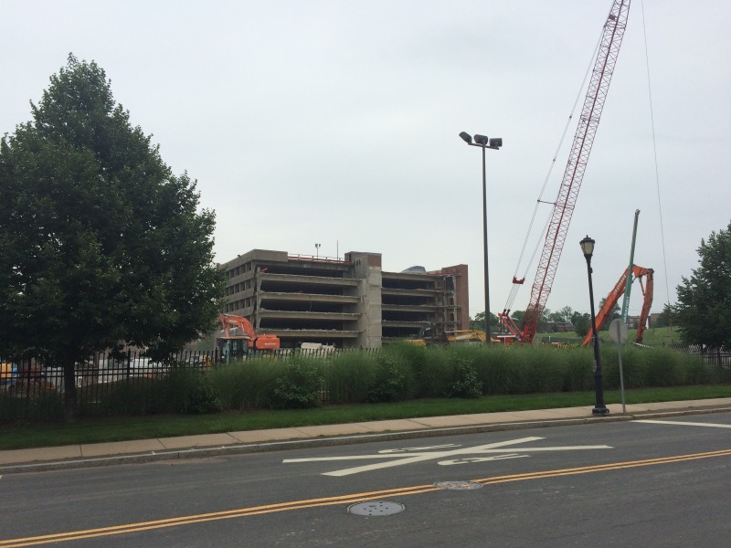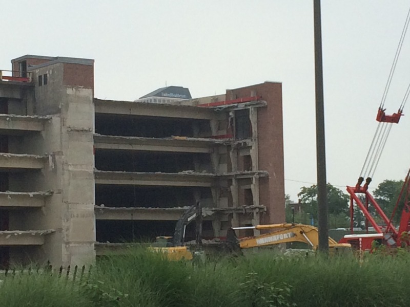 The demolition of the Fraser Place Garage proceeds apace, and already we can catch a glimpse of what the new view will be once the parking garage is gone.