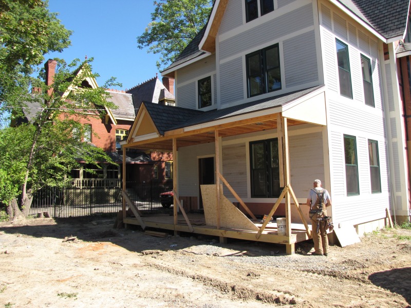 Jeff Giddings at work on the front porch. Around the corner, on the north side of the house, there's a space where we will install a sunflower plaque, which is now finished and over at the house. The plaque, prepared by local artist Jackie McKinney, takes a sunflower plaque on the west side of 181 Collins Street as its inspiration. Rumor has it that the sunflower was a particular favorite of George Keller, whence our theory that 181 Collins is a Keller house.