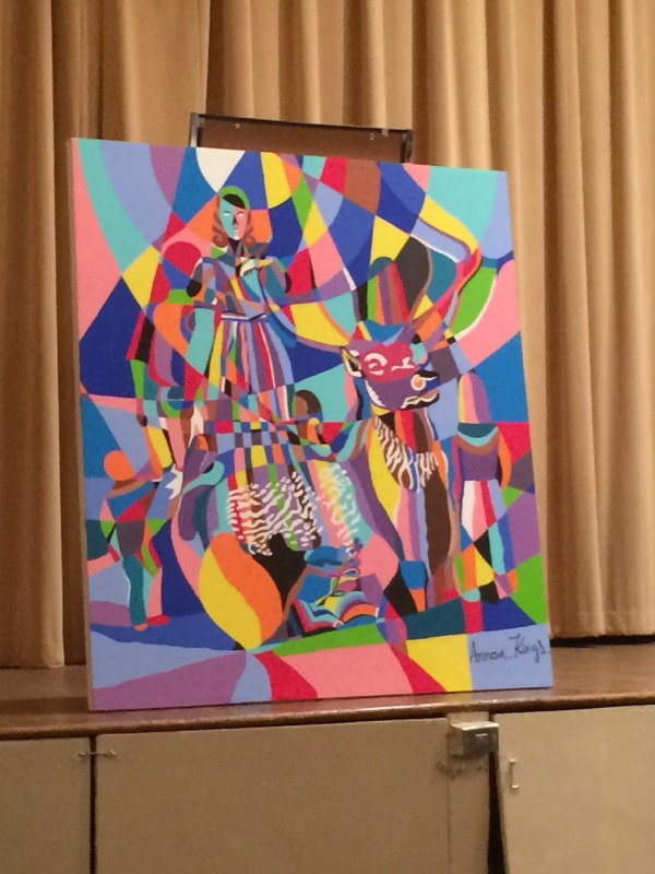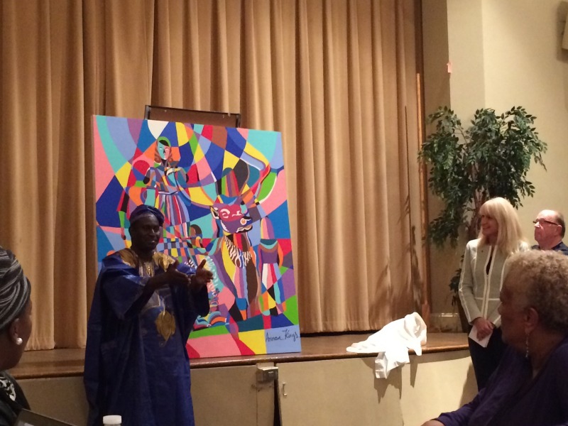 At the AHNA monthly meeting this evening, Georges Annan-Kingsley presented a painting to the neighborhood. This painting was commissioned by The Hartford, and it will be translated into a much larger format and hung on the Collins Street side of The Hartford's new parking garage. Georges, an immigrant from Cote d'Ivoire, is an internationally known artist, and he has been very active in Asylum Hill.