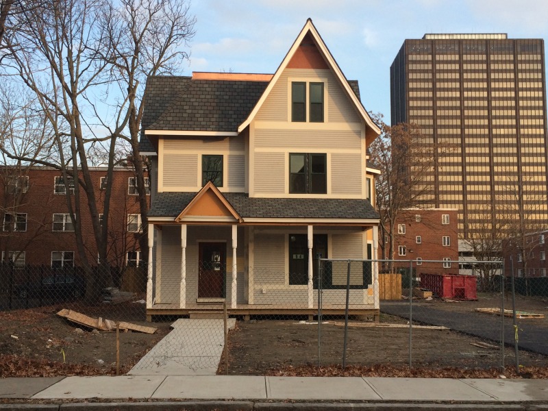 We're down to the porch rail and the exterior paint at this point. Also, we like the view of The Hartford in the background -- The Hartford has supported this house with funds and volunteers, and it shows that they are quite literally our neighbor on this project.