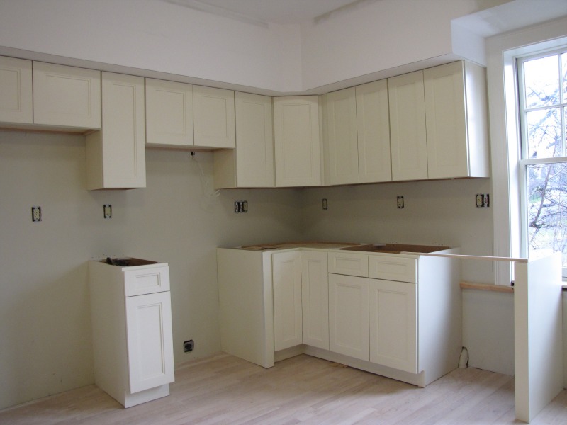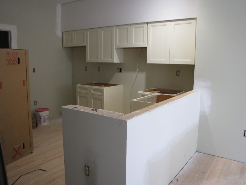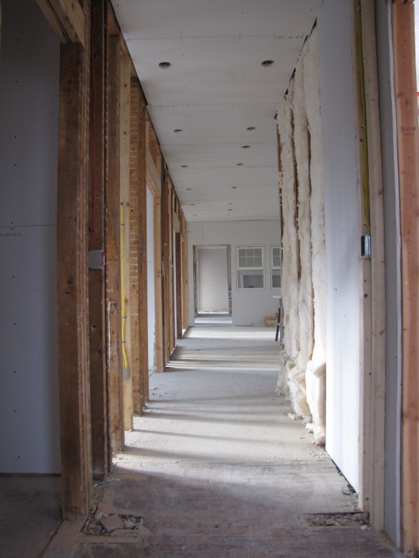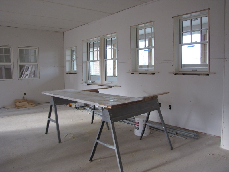 The exterior is almost finished, and the interior is taking shape as walls go up and counters and cabinets go in. Interior views include