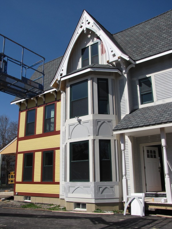 The new woodwork is now in place in the side gable, and as you can see we’re starting to look at different paint colors for the house. Also, there’s a view of 181 Collins Street and 54 Huntington Street that we haven’t shown before, looking from the corner of Collins and Huntington rather than back up the street from 54.