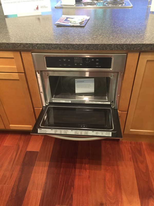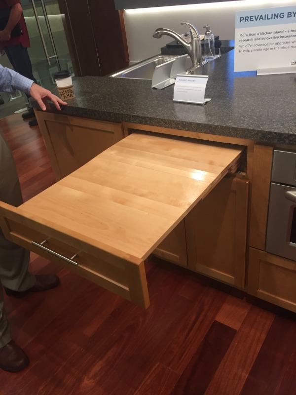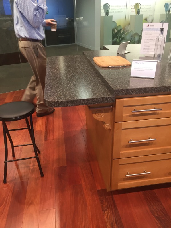 It's not the sort of offer we get everyday, but Ken Johnson and MIke Stockman went over to have a look and take some measurements. It's actually lovely -- it's a "butcher block" with everything it, from cabinets to the stove to electric outlet to, yes, the kitchen sink. It was designed to keep everything low and within reach, which reminded us of the kitchen we installed over at 1 Imlay, but really this one was made with seniors in mind. And it bears the AARP seal of approval, AARP being a co-sponsor of this model kitchen exhibit with The Hartford.