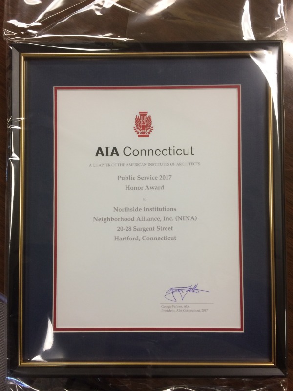This evening, Tiana Hercules accepted the 2017 Public Service Honor Award from the Connecticut Chapter of the American Institutes of America (AIA) on behalf of NINA. AIA selected NINA for this honor because of NINA's commitment to revitalizing Asylum Hill in partnership with neighborhood residents and community partners. AIA Connecticut specifically cited NINA's "multidimensional skills at rehabilitation, marketing, and finding the funds" to undertake its historic rehabilitation and preservation efforts.