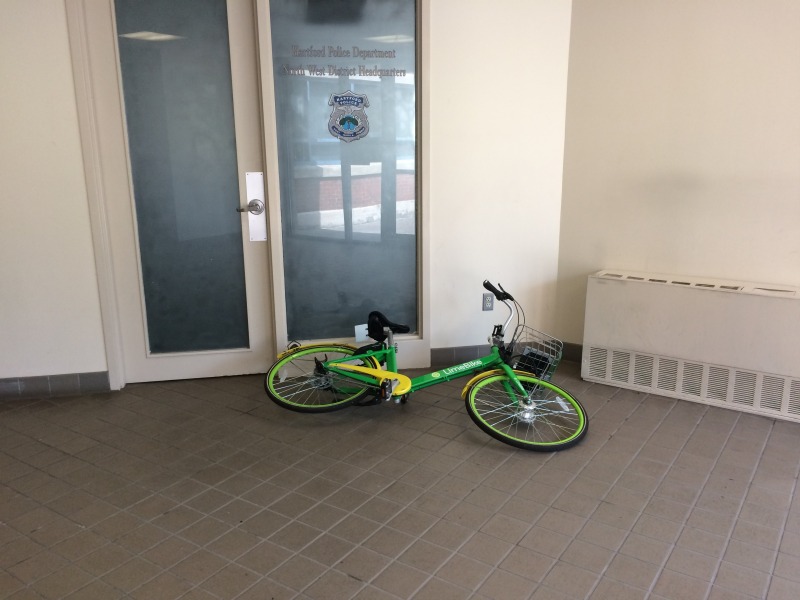 We really were thrilled when Lime Bike rolled out in Hartford, and we’ve been equally thrilled to see so many of them about Asylum Hill, clearly indicated how useful they’ve been to people. But today we encountered this one dumped in the Veeder Place lobby – presumably, someone rode it here and then didn’t want someone else to ride off with it, but still.