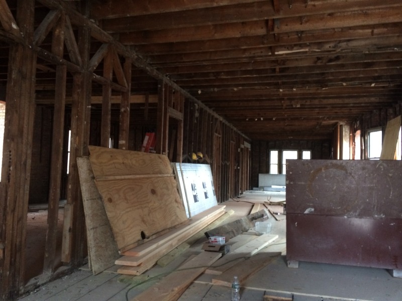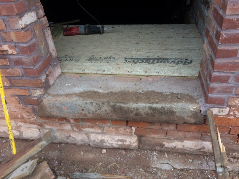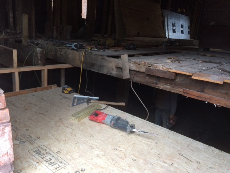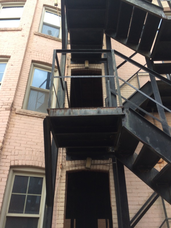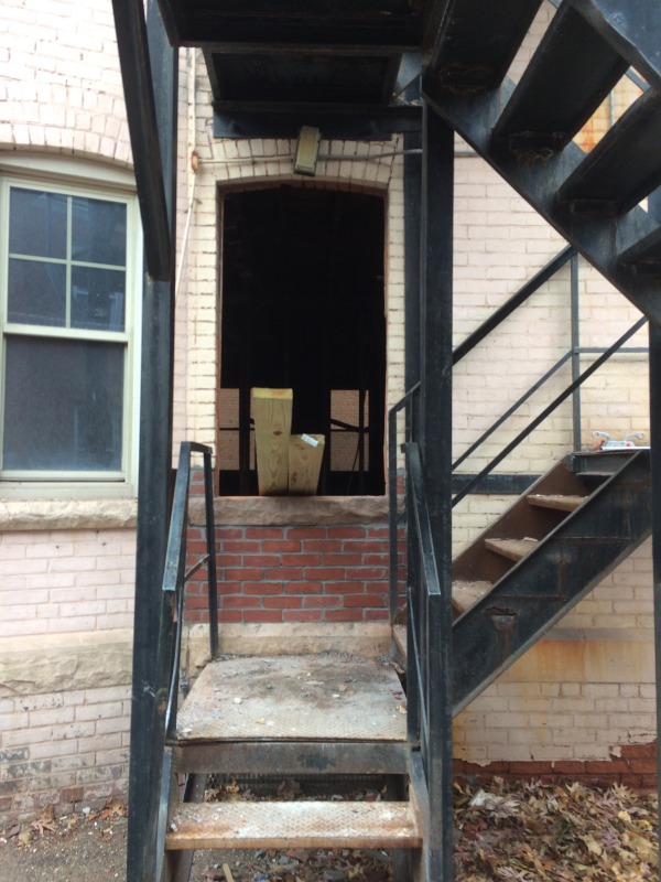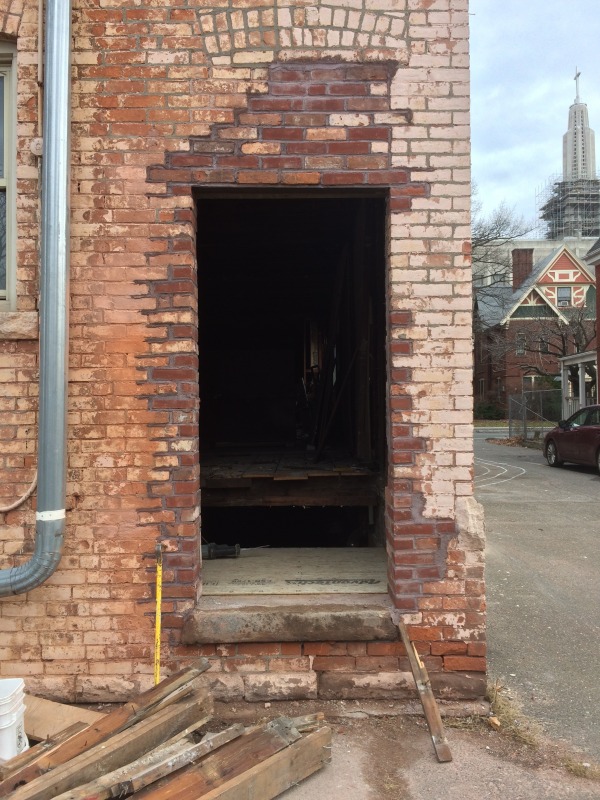Over at 117 Sigourney, we've started on new egresses as well as closing up old ones. Along the south side of the building, we've removed the doors that led to the fire escape, and this work is then a prelude to removing the fire escape altogether. Around at the back of the building, we're adding a new egress: this new back door will lead to a new, interior staircase that will have access to each of the three units. We think this will make for a much more attractive, safe, and sustainable building. The old iron fire escape is not particularly safe, and it can get very slippery. The new staircase, which opens up directly onto the parking lot, will be protected against inclement weather and will probably now become the main point of entry for the future residents. Who would want to take their groceries all the way around the front of the building?