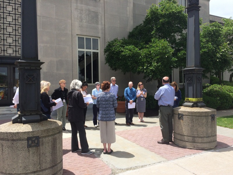 Edward Peltier and Jean Linderman from the American School for the Deaf came down today to take people on a tour of the former campus of their school – which, of course, is currently The Hartford. They led an informative tour that showed people where the school’s various buildings had been, and they explained the connections the neighborhood still has to the school: Asylum Avenue, Cogswell Street, and the statue of Alice Cogswell in Gallaudet Triangle.