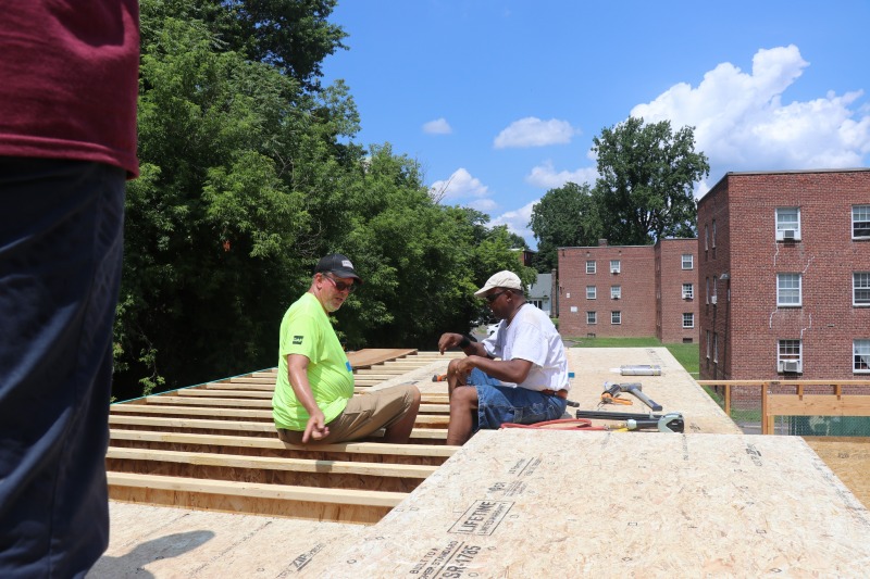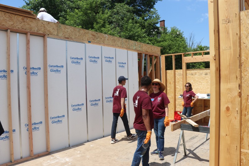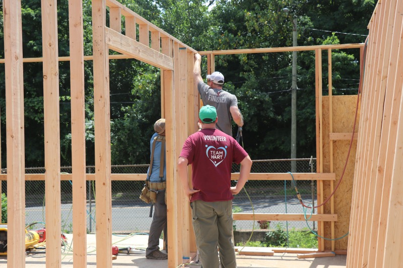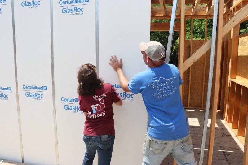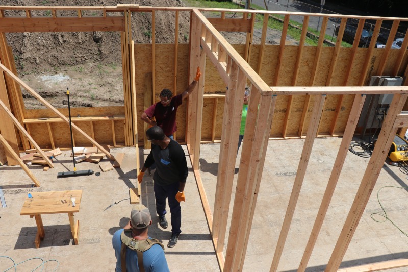 A group from The Hartford came down to 86 Hawthorn today to pitch in with the framing. The group included Andy Daly and Rachel Pattison, both members of NINA’s board of directors. It was a blistering hot day, but they worked hard, stayed hydrated, and had a good time.