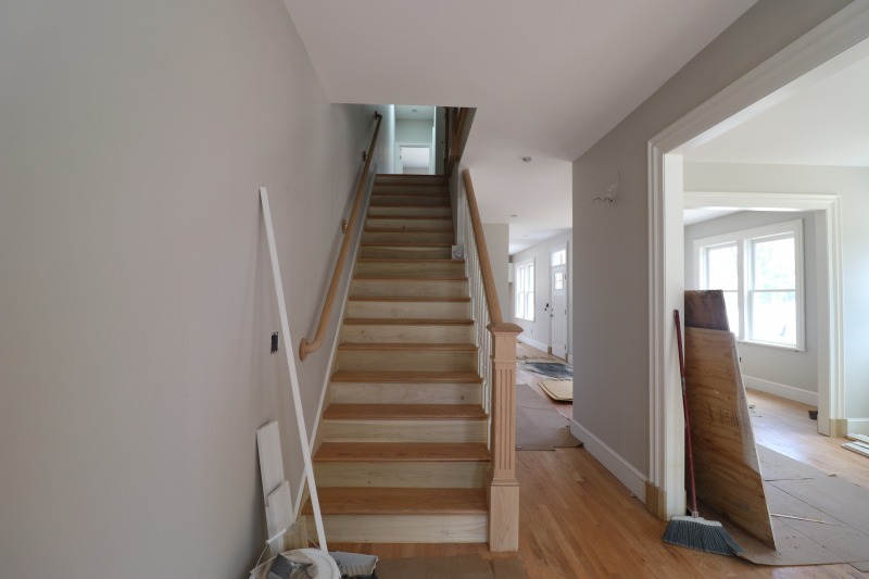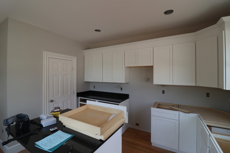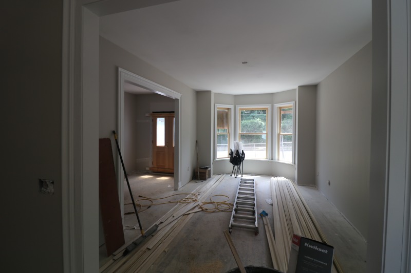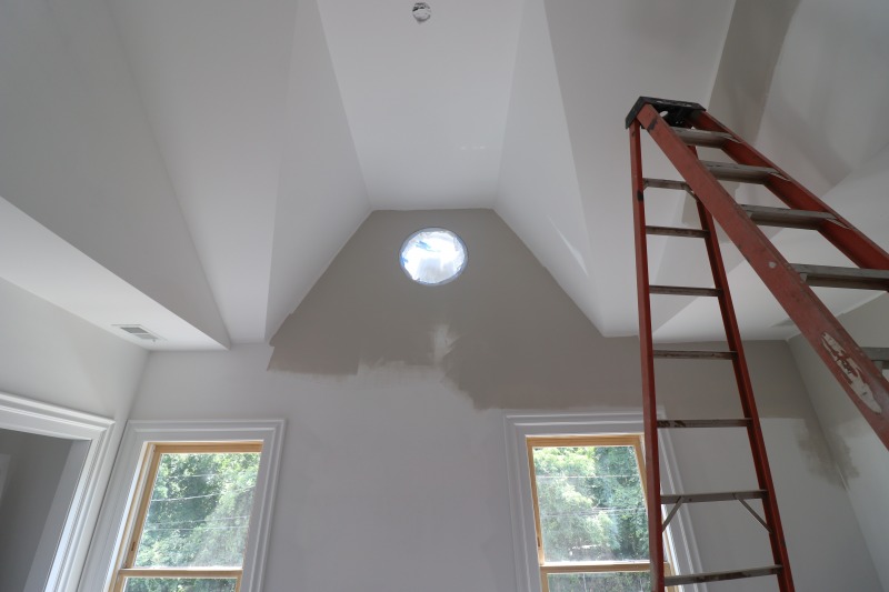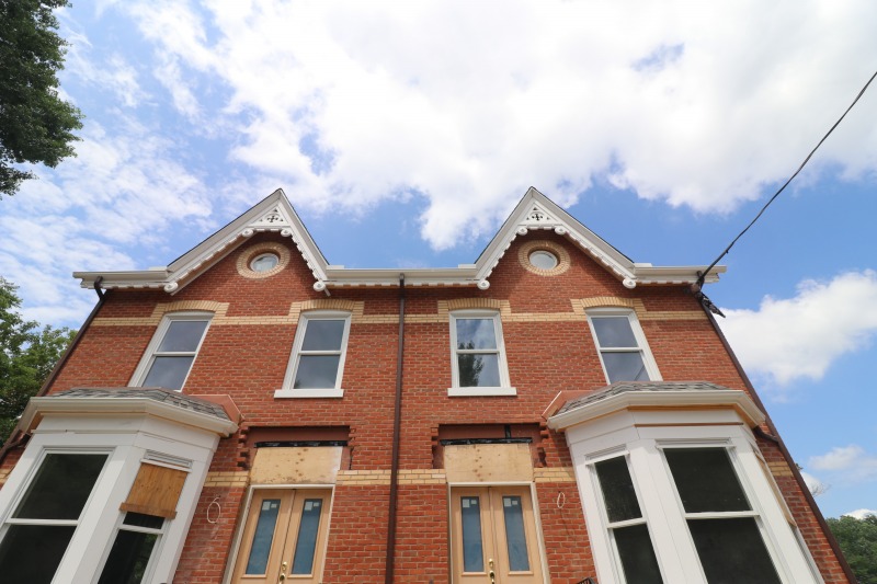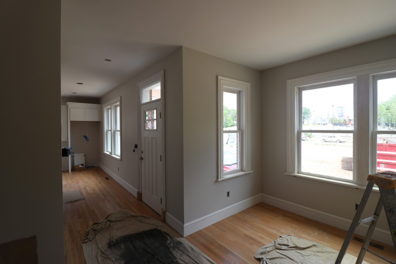 Work on the interior – and front doors! The space created in the brick above the front doors is for stained glass inserts.