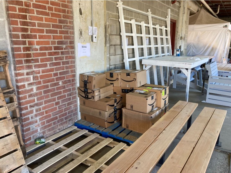 We brought the latest shipment up to Veeder Place today. The benches in front of our pallets, and the wood furnishings in the background, are Fresh Start Pallet Products creations. They paint their pieces out on the loading dock in that tent there in the back. And I should add that the unpainted pallets belong to Fresh Start, too – they’ve very graciously let me borrow them while we continue to order more books for West Middle.