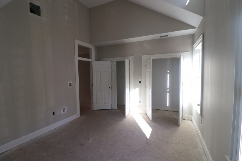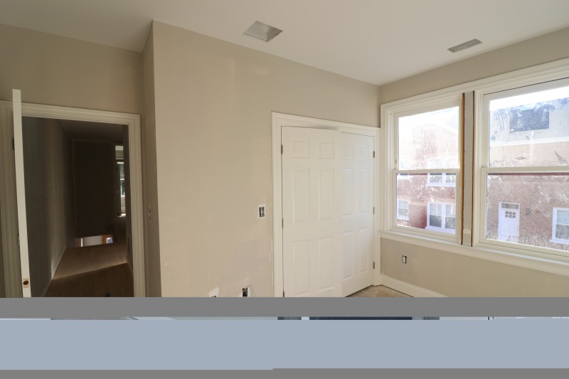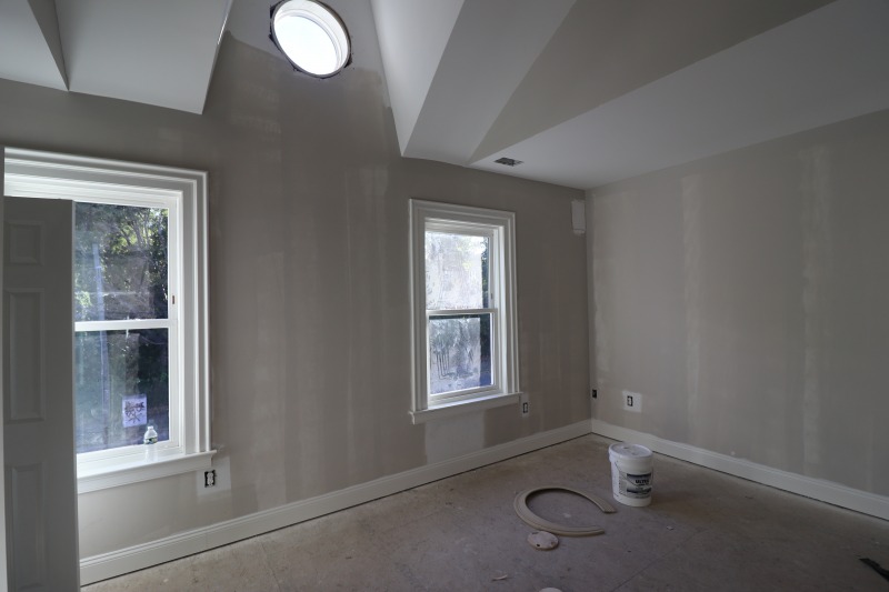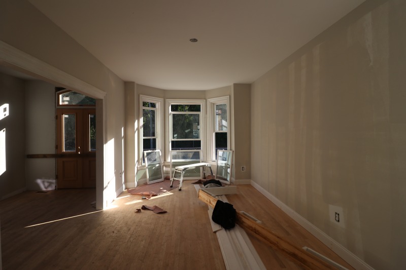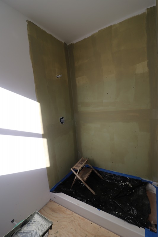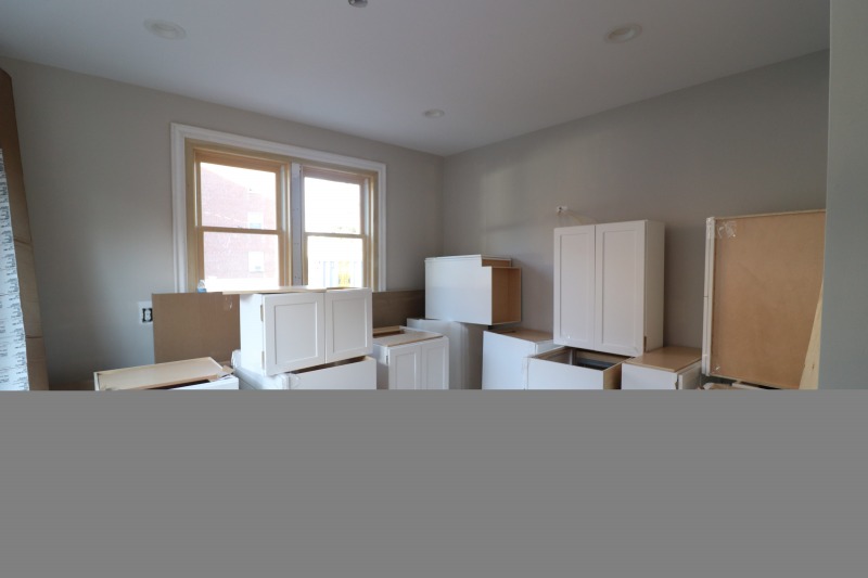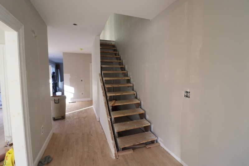 Inside, there are stairs, newly painted walls, preparations for bathroom tiling, and kitchen cabinets.