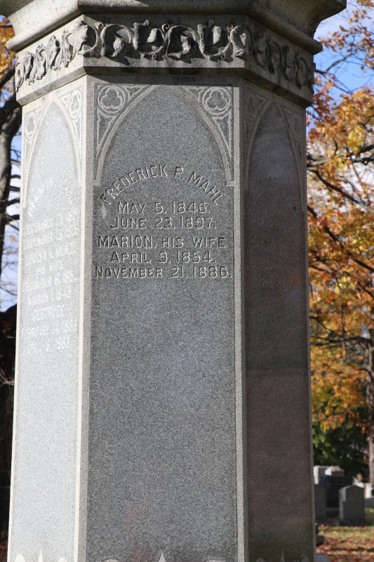 Frederick Mahl – he who built numerous houses on Ashley Street, and his wife Marion died in 1886. That’s really, really interesting to me, because I have an article from the Courant that reported that his wife spoke to Frederick at a séance, which means that wasn’t Marion – and I have no idea where his second wife is buried!