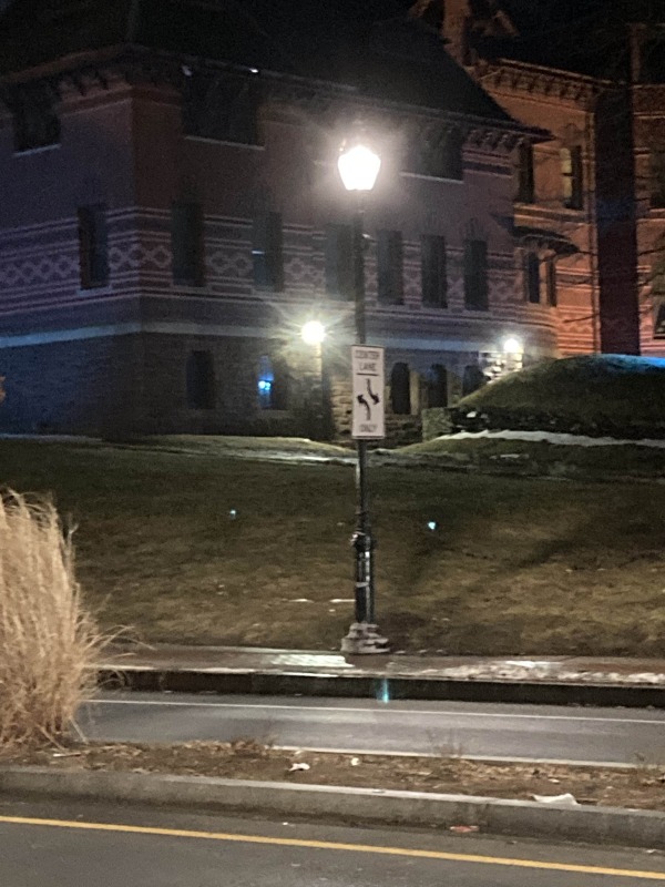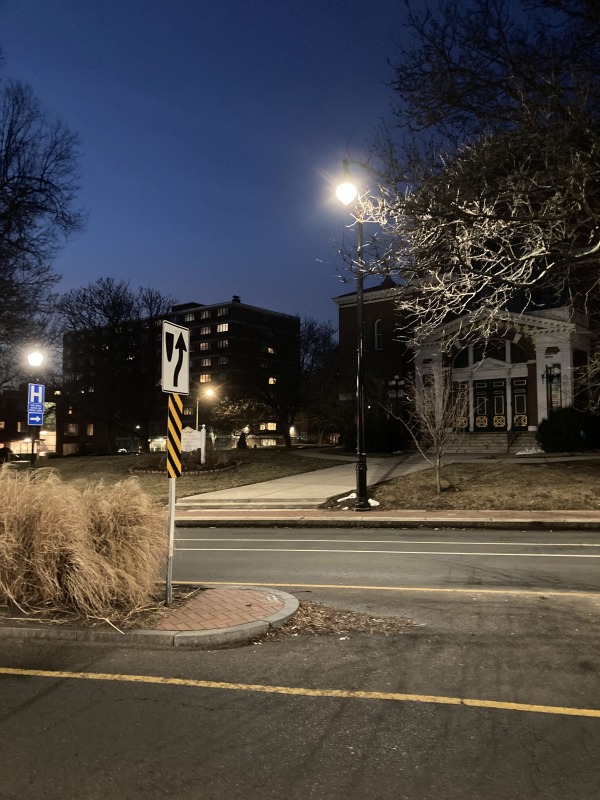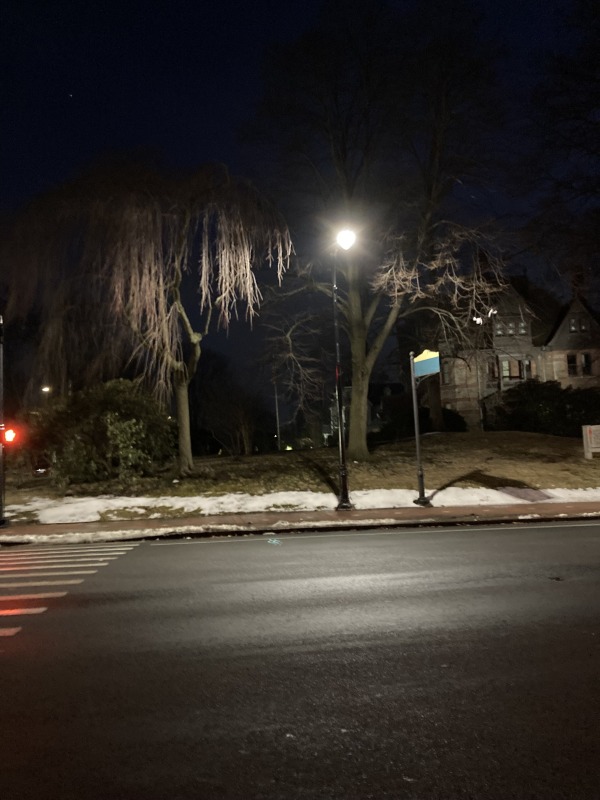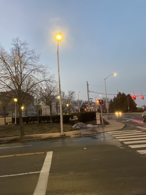 Based on my experience on Sigourney Street, I walked up to Farmington and Broad a little before 6 PM, and then waited. Sure enough, the lights popped on at 6, so that’s the time they’re supposed to go on, at least this time of year. Farther down the street, some of the decorative streetlights were out. One more thing to add to our analysis.