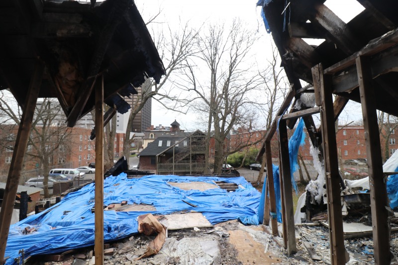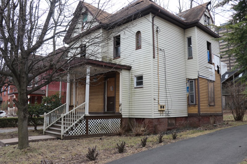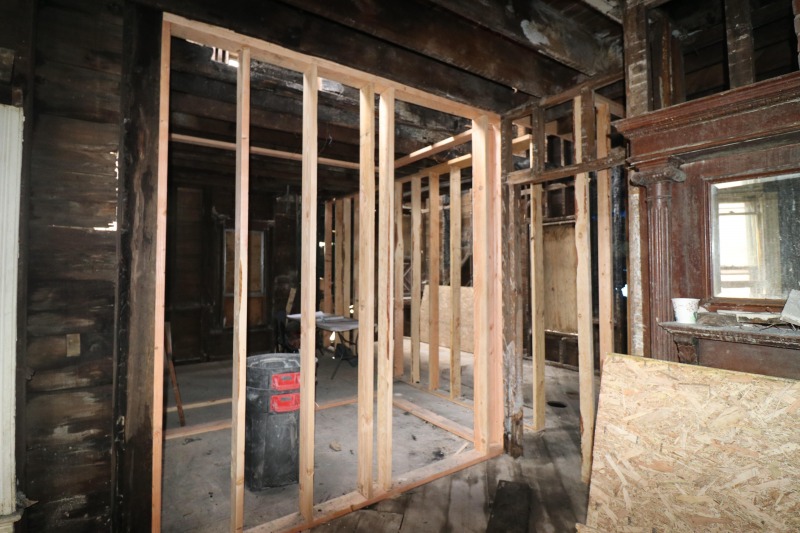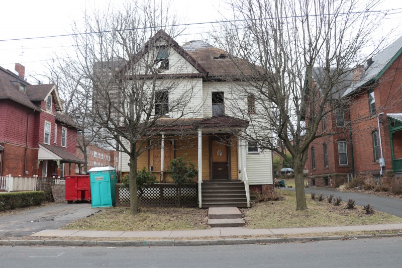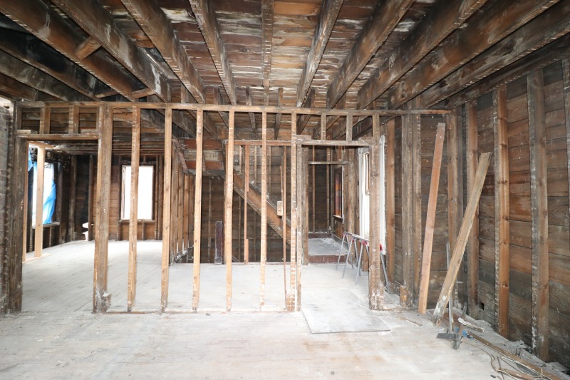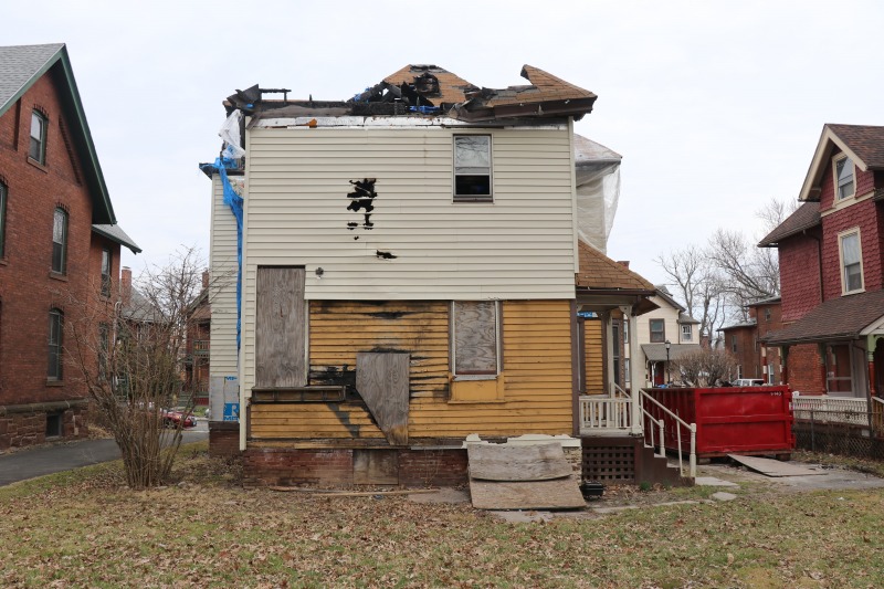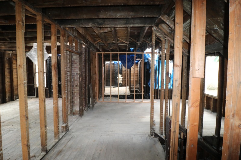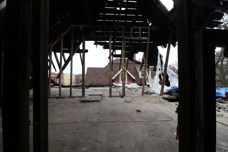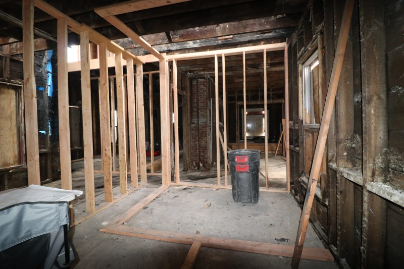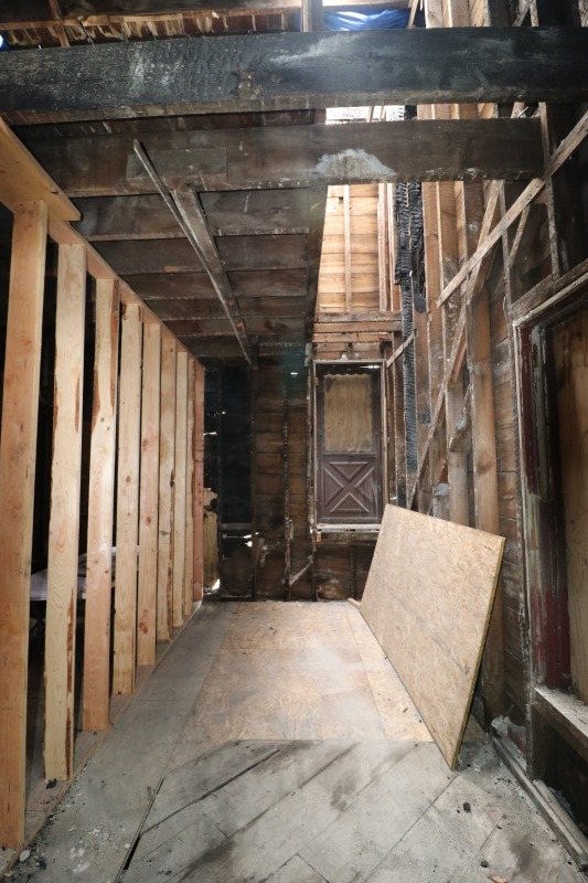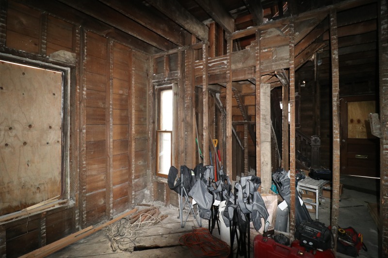 Interior framing has begun inside the house, while work on the siding continues outside. The back staircase, which had been a separate egress for an upstairs rental unit, has been removed. The third floor remains daunting. A very good sign is the arrival of the "ServCorps chairs," which means we are now well underway.