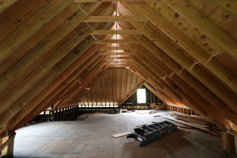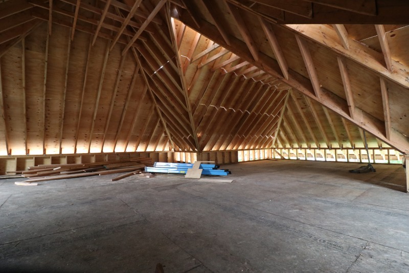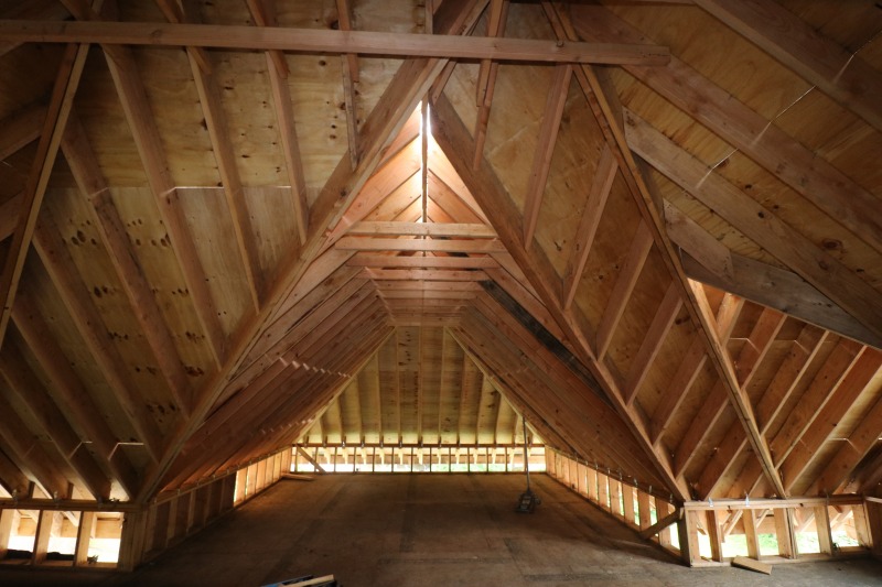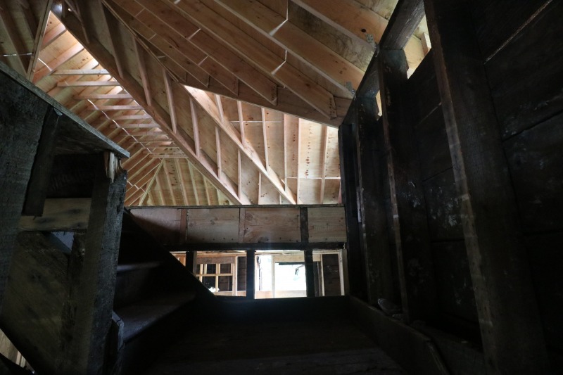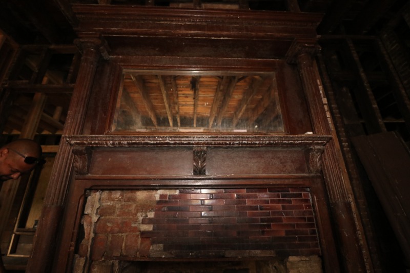 More framing, looking up under the new roof, and a fun shot of the first-floor fireplace.