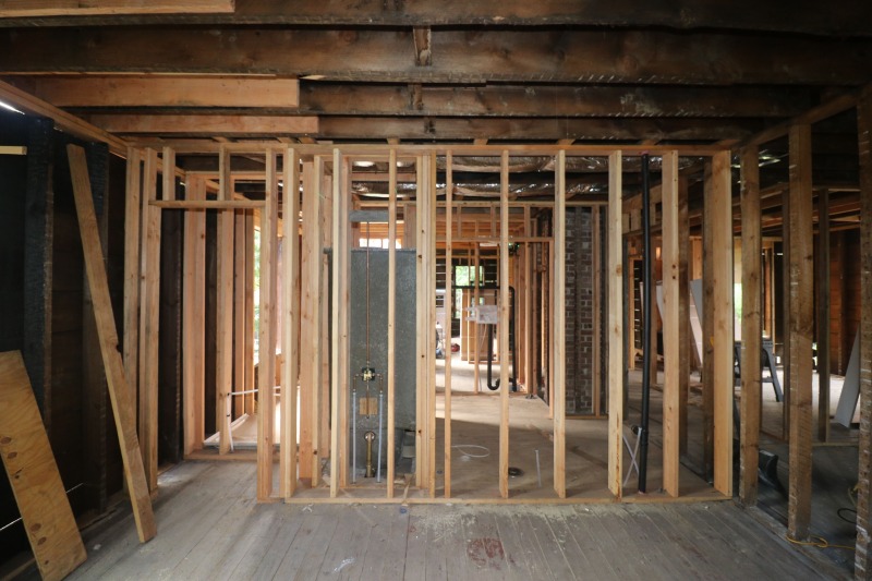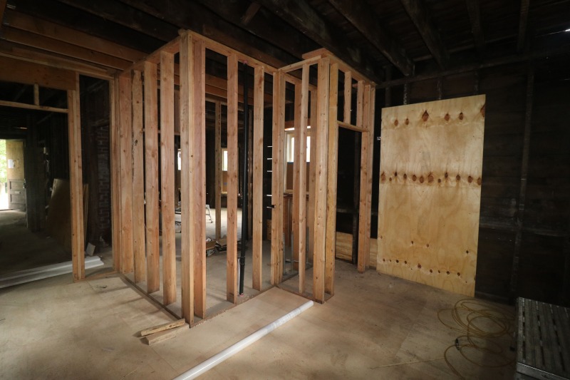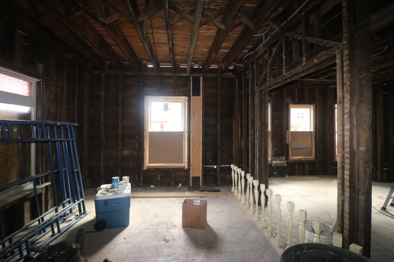 The kitchen taking shape, along with the first-floor half bath. More windows in. Spindles painted by Aetna volunteers in the end of July.