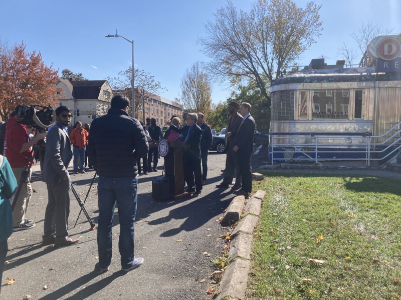 At a press conference today, State Representative (and Speaker of the House) Matt Ritter announced $1.3 million for the State's Community Investment Fund for the rehabilitation of the Comet Diner. Ritter was joined by Luke Bronin, Hartford Mayor; Douglas McCrory, State Senator for the 2nd District; Wayne Benjamin, Georgetown Associates; David MacDonald, executive director, AHNA; and Jackie McKinney, chair, AHNA. Ritter, who represents the 1st District in the State House, has been an active supporter of projects in Asylum Hill, including NINA's projects. AHNA helped put together the application for this funding. The combined support from government and community is a real boost for this project, and it will restore an important landmark and restaurant in Asylum Hill.