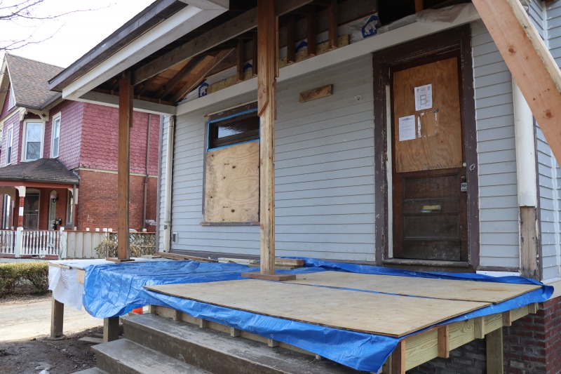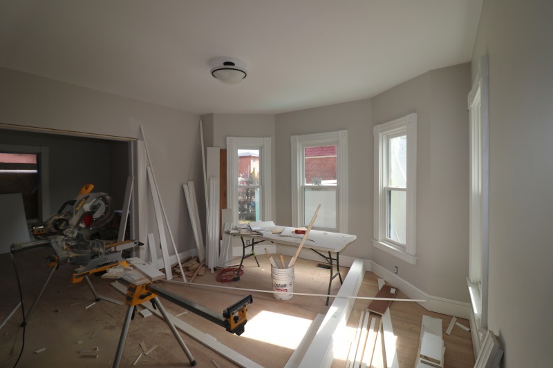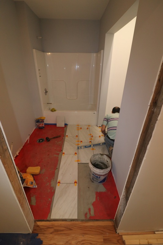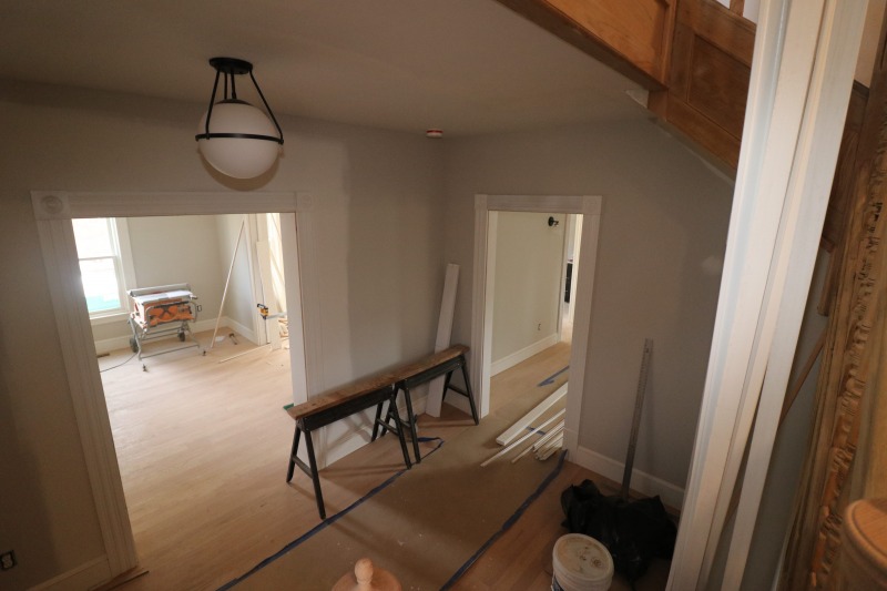 Window and door frames are going up, the decorative pediments are back on the main staircase, and the tiles are going into the second floor bathroom. Plus some work on the front porch.
