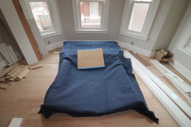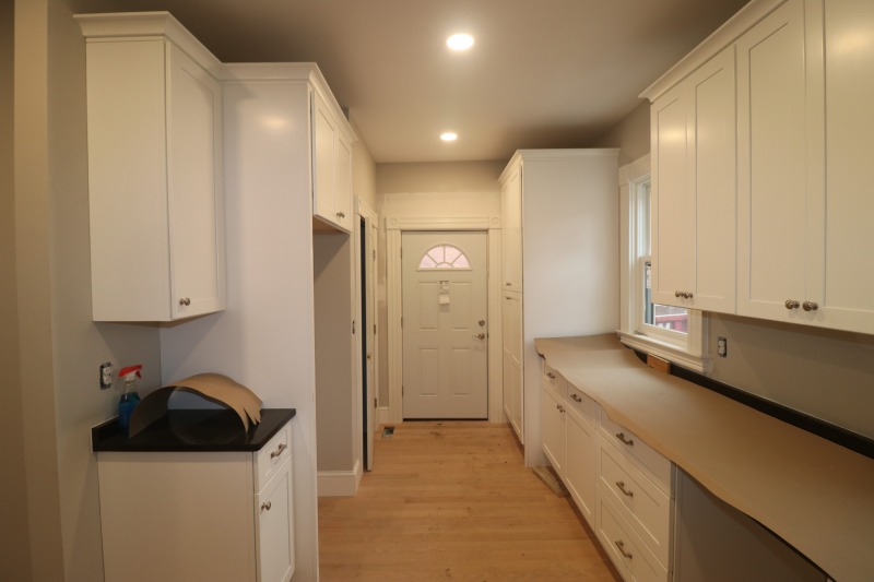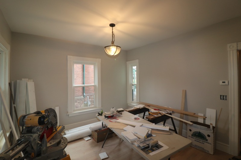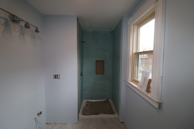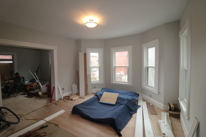 A more complete kitchen. Light fixtures abound. And that’s the fireplace surround and mantle in the parlor, not a futon. Plus the shower in the bathroom in the primary bedroom and a new floor for the front porch.