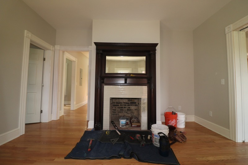 The fireplace being tiled in the surround. Work on the front porch.