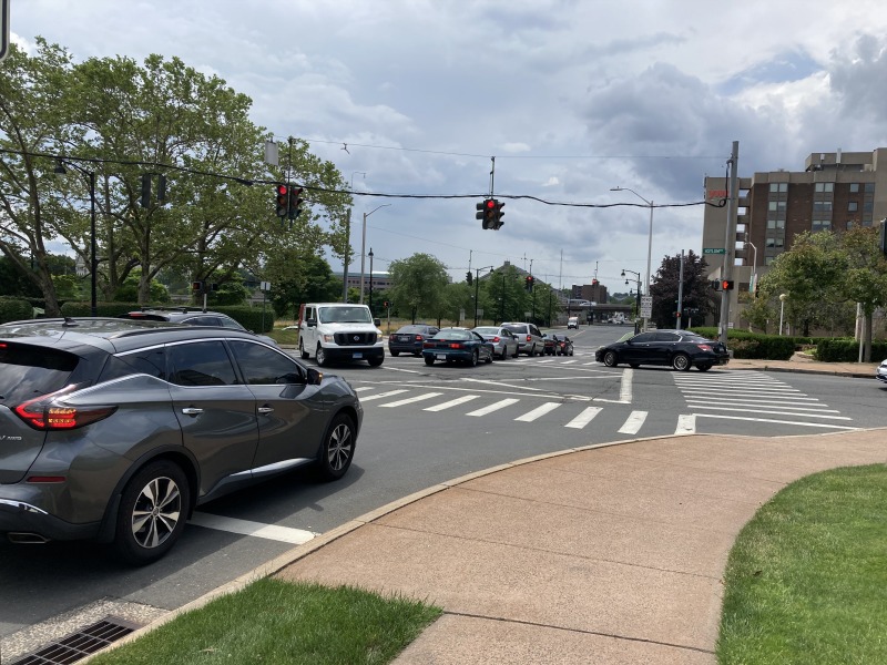 The van turning left onto Asylum Avenue (westbound) has a green arrow, but it can only squeak through.