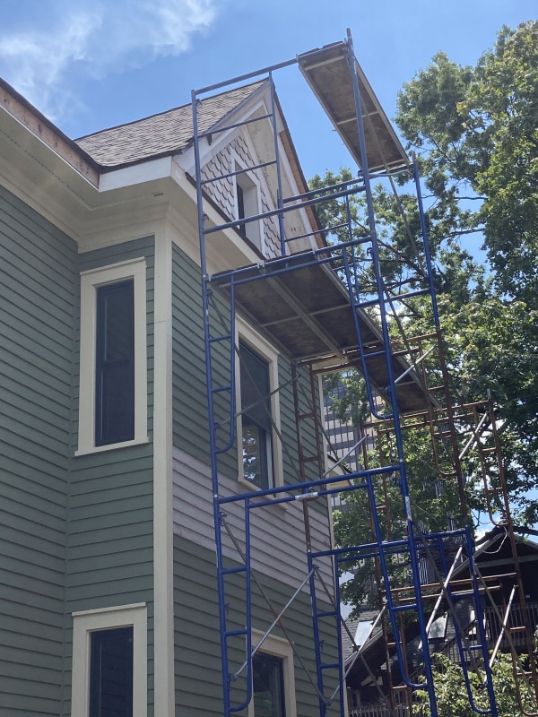 Work in the front and side gables, with the oriel window in the front gable really taking shape.