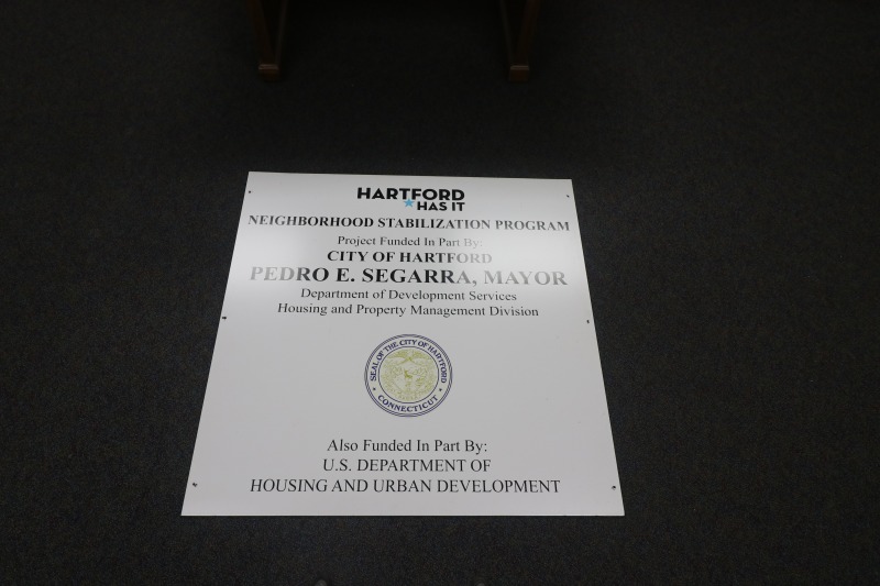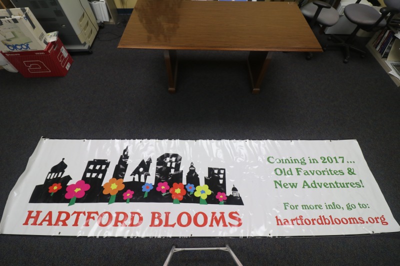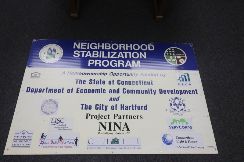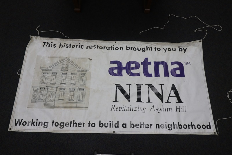 Banners and signs include: the 2017 Hartford Blooms banner; our sign for projects funded by the federal Neighborhood Stabilization Program (we used this at several houses); the Hartford version of the NSP sign; and our banner proclaiming our partnership with Aetna on 1 Imlay Street.