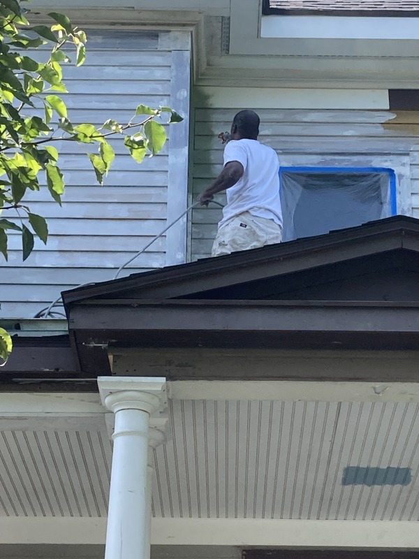 At work on the exterior, and progress at the end of the day.