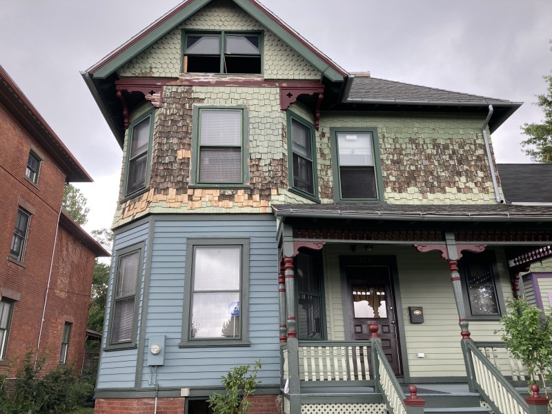Clapboard on the first floor has been painted, and shingles on the second flor have been replaced.