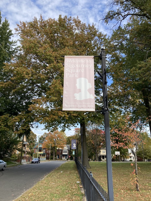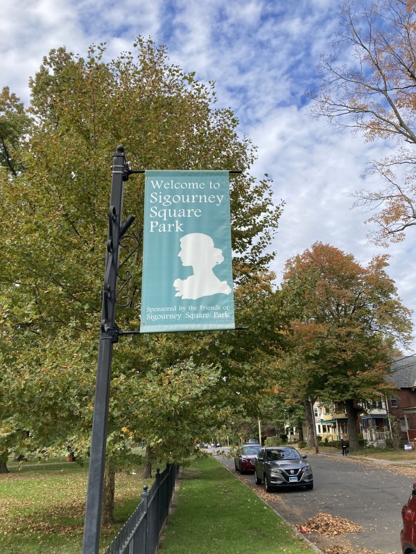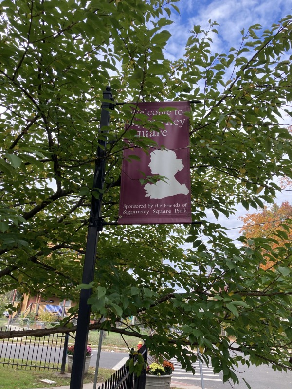 David Macdonald and I went around Sigourney Square Park today and had a look at the banners there. David, who is executive director of the Asylum Hill Neighborhood Association, helped to secure funding from the City’s “Love Your Block” program, which will allow us to replace the banners. They are really quite faded, but of greater interest is how the trees now obscure some of them!