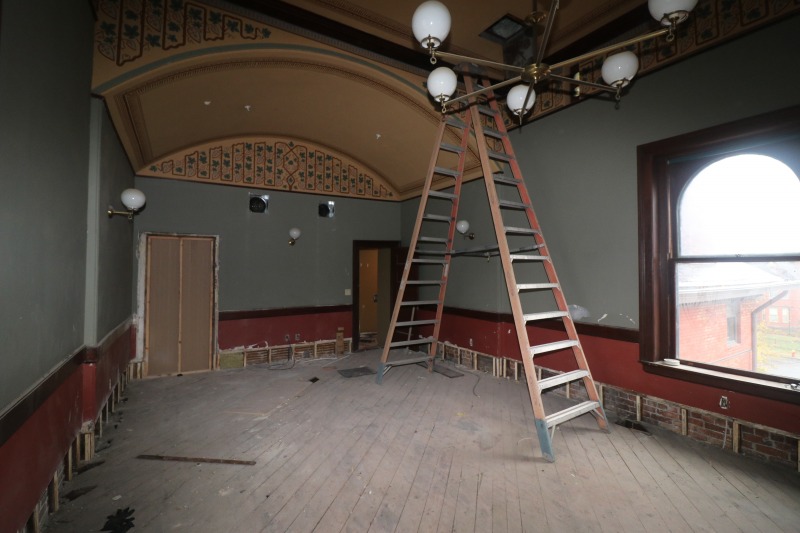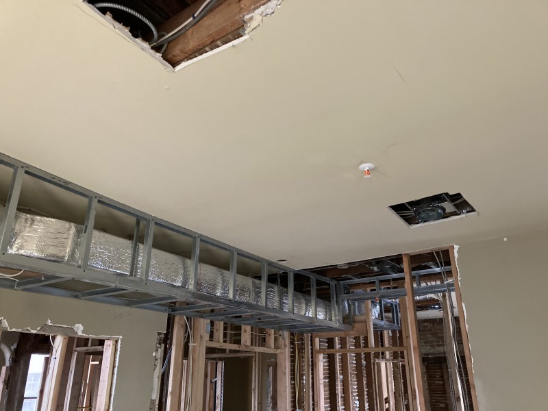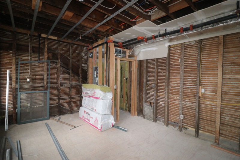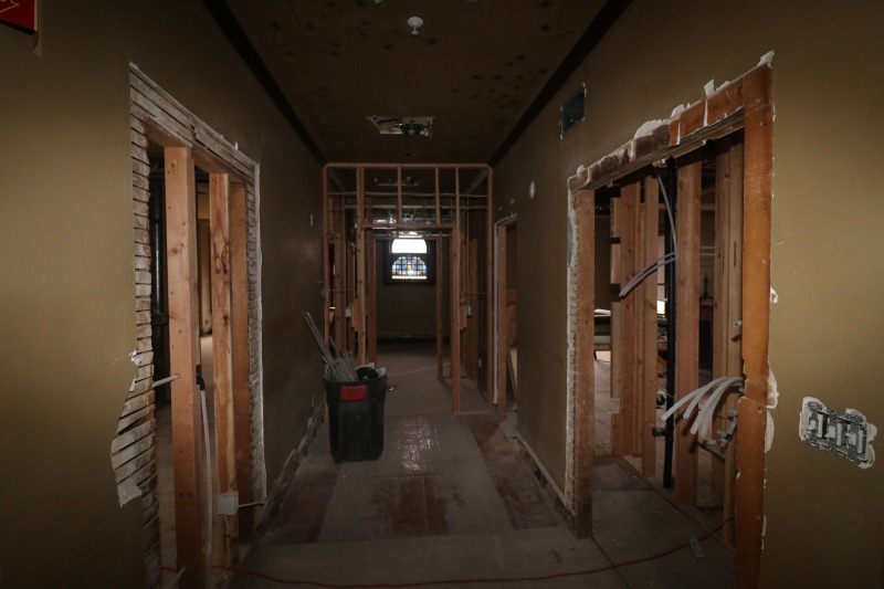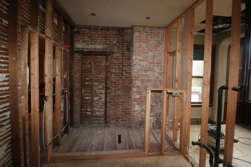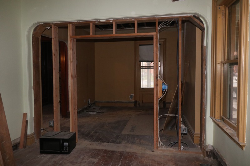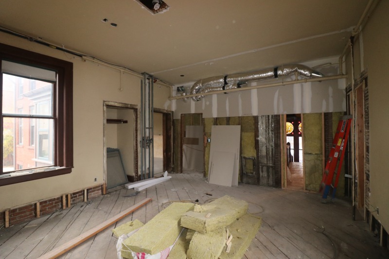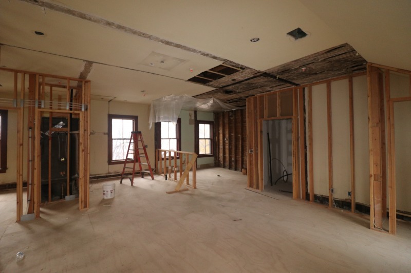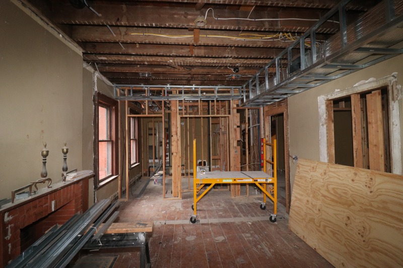 Ductwork for the HVAC system, second floor, future primary bedroom, owner’s unit; framing in east side parlor, first floor; new configuration, hallway, second floor, owner’s unit; framing and ductwork, second floor bedroom, owner’s unit; shower, bathroom in primary bedroom, second floor, owner’s unit; electrician’s ladder, billiard room, third floor, owner’s unit; primary bedroom, second floor apartment; kitchen and dining area, second floor apartment; west bedroom, second floor apartment; third floor apartment looking into kitchen and dining area