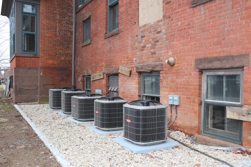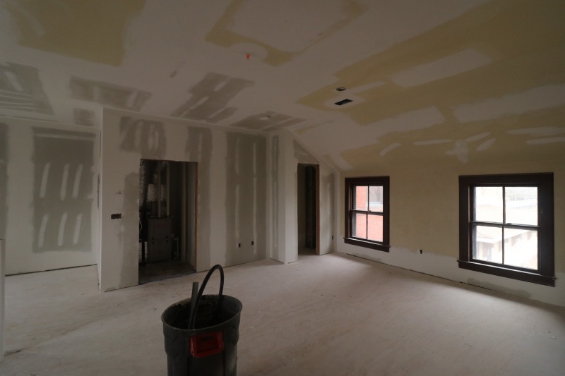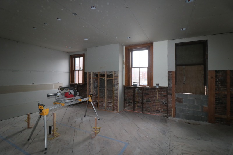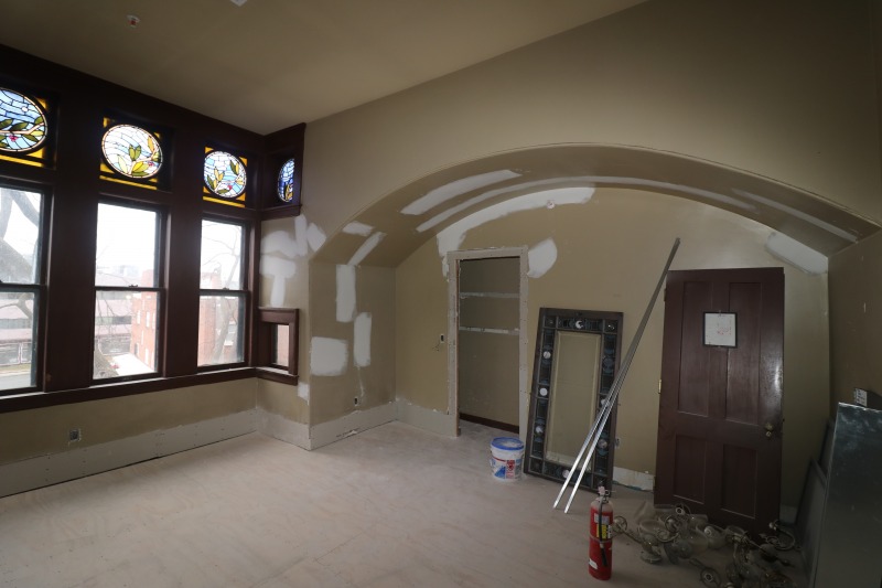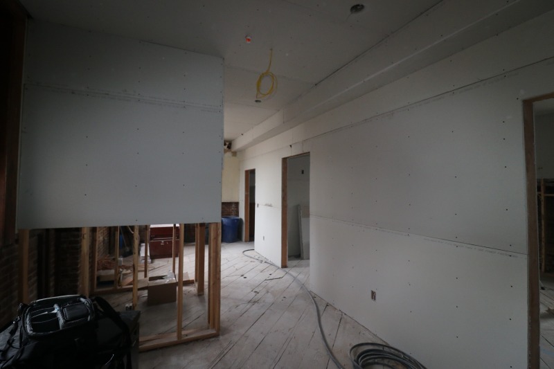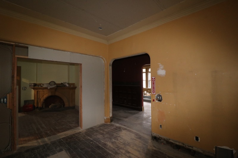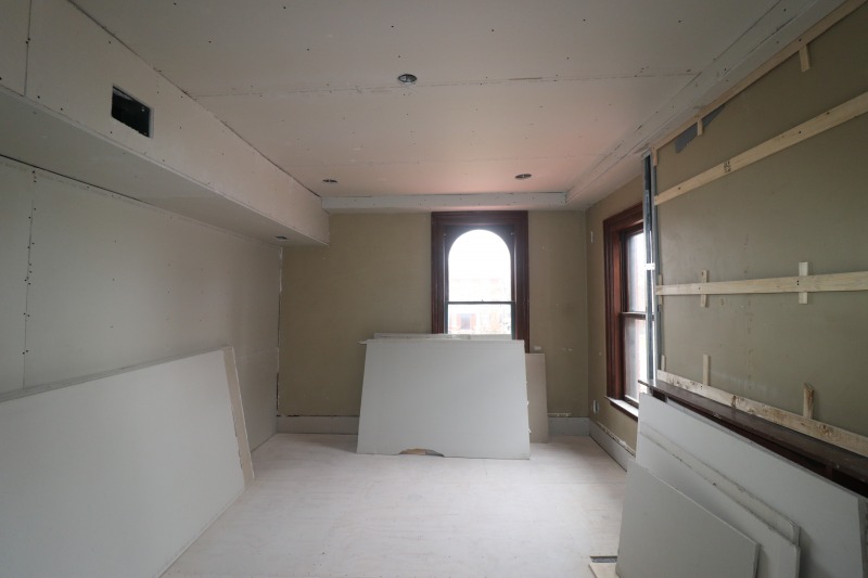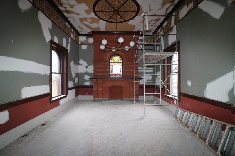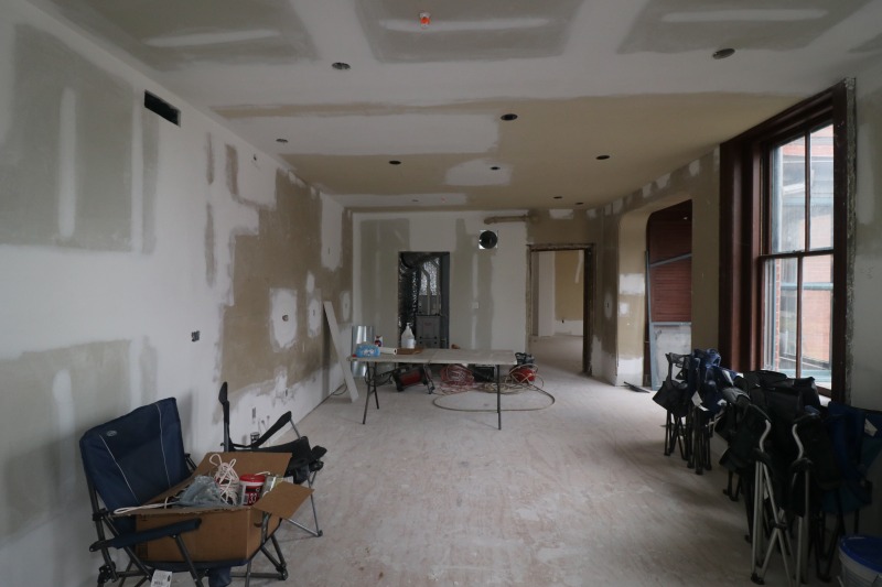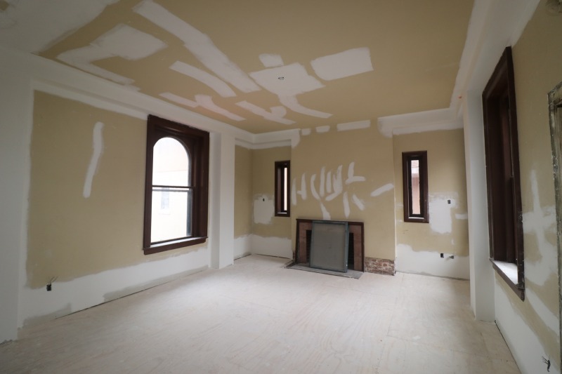 1st floor kitchen and former kitchen taking shape. 1st floor east parlor. 1st floor main parlor with ceiling. 2nd floor east bedroom. 3rd floor landing. 3rd floor back bedroom. Repairs to the 3rd floor billiard room. 2nd floor apartment west bedroom. 2nd floor apartment dining area and kitchen. 2nd floor primary (east) bedroom. 3rd floor apartment living area. HVAC outside.